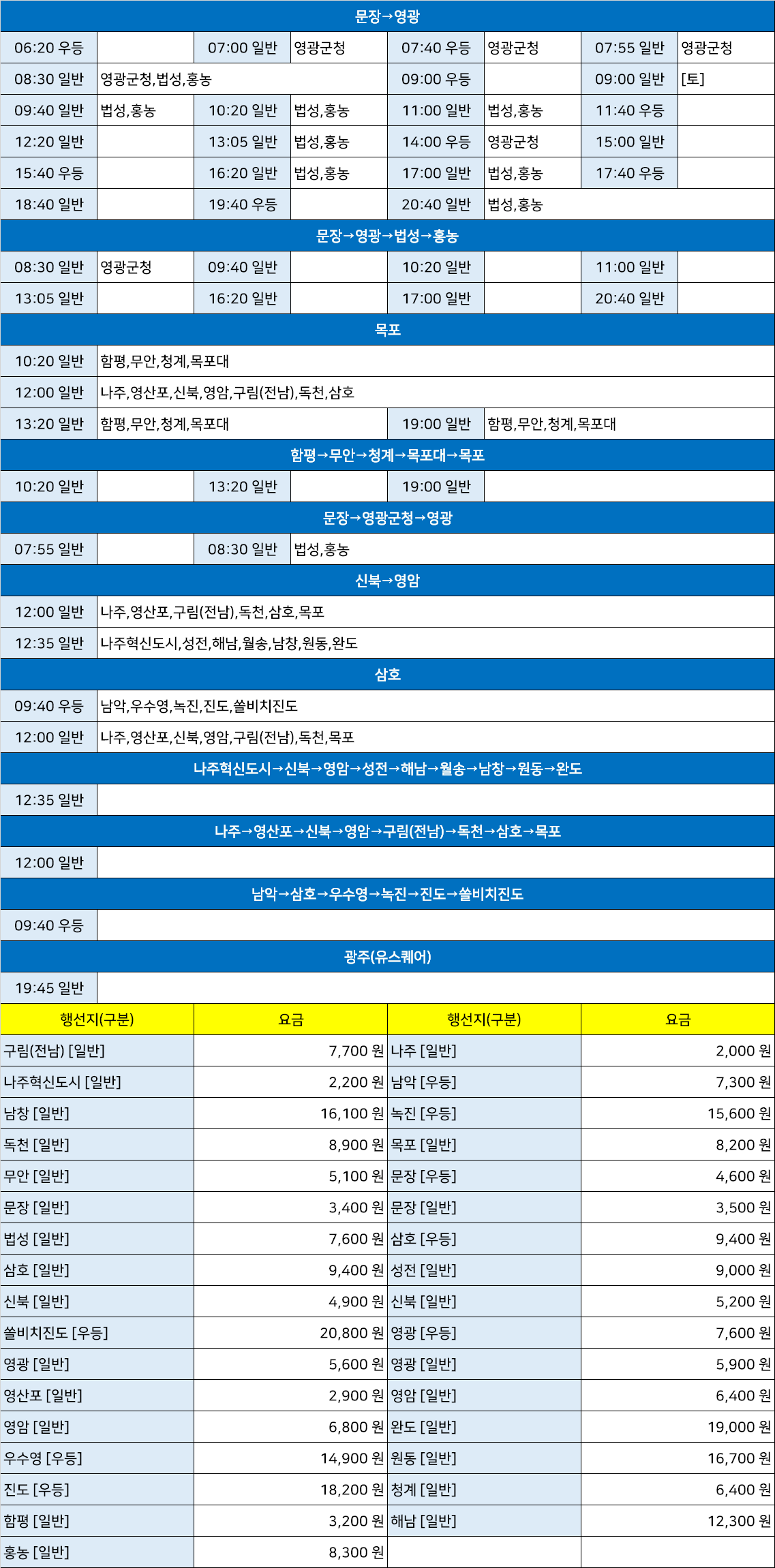 광주송정역시외고속버스터미널 송정역정류장 송정역정류소 광산군터미널 → "광주(유스퀘어),나주→영산포→신북→영암→구림(전남)→독천→삼호→목포,나주혁신도시→신북→영암→성전→해남→월송→남창→원동→완도,남악→삼호→우수영→녹진→진도→쏠비치진도,문장→영광→법성→홍농,문장→영광군청→영광,함평→무안→청계→목포대→목포".