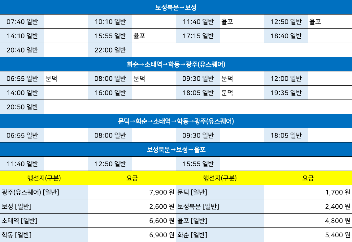 복내시외고속버스터미널 복내정류장 복내정류소 → "문덕→화순→소태역→학동→광주(유스퀘어),보성북문→보성→율포".