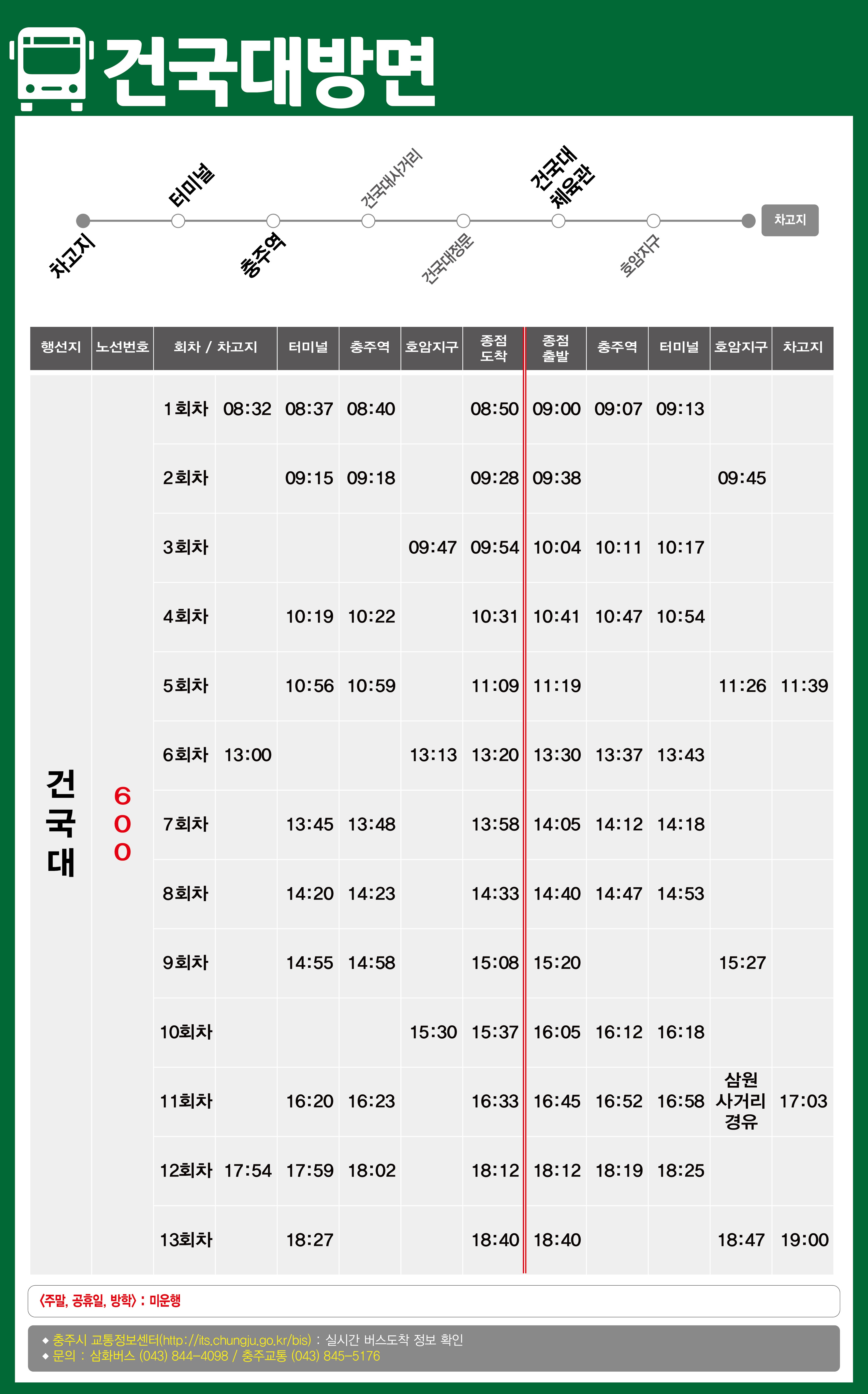 차고지→충주터미널→충주역→건국대사거리→건국대정문→건국대체육관→호암지구→차고지