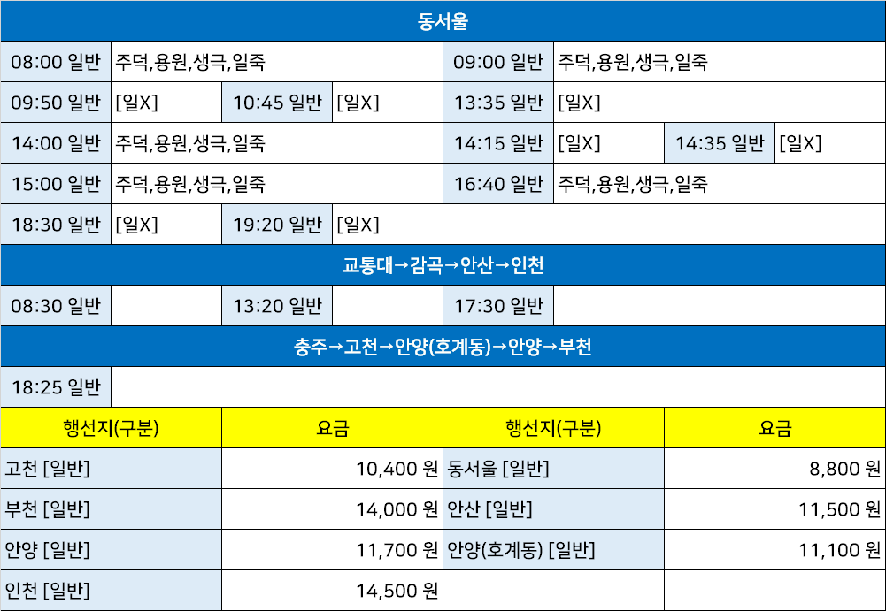 충주건국대시외고속버스터미널 충주건국대정류소 충주건국대정류장 → "교통대→감곡→안산→인천,동서울,생극,용원,일죽,주덕,충주→고천→호계동→안양→부천".