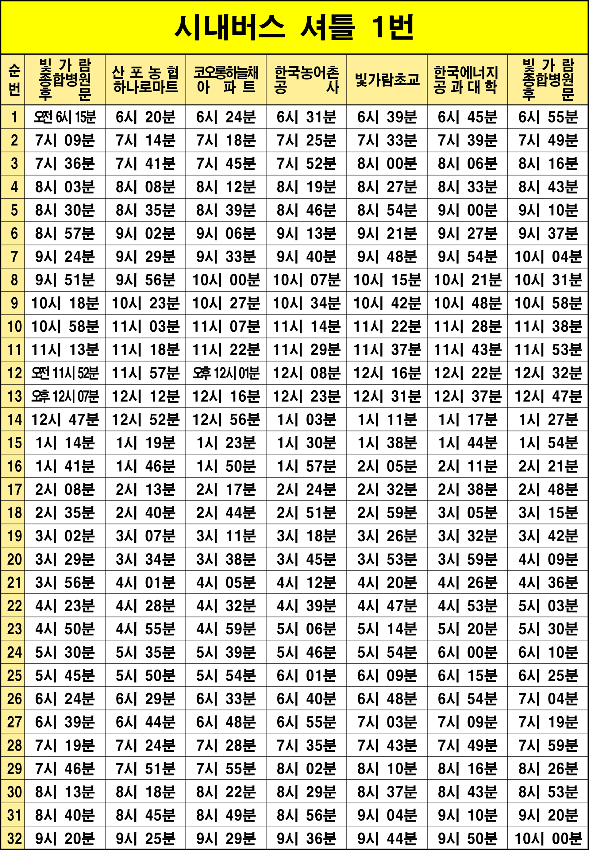나주 셔틀버스1번: 1. 빛가람병원후문(기점/환승) → 2. 우정사업정보센터후문 → 3. 한빛1교 → 4. 산포농협.하나로마트 → 5. 중흥S클래스리버티 → 6. 유전저수지 → 7. 우미린아파트(북) → 8. 코오롱하늘채후문 → 9. 코오롱하늘채정문 → 10. 코오롱하늘채후문 → 11. 우미린아파트(북) → 12. 우미린아파트(동) → 13. 전력거래소 → 14. 한국농어촌공사 → 15. LH1단지정문 → 16. 라온초등학교 → 17. LH3단지 → 18. 빛가람초중교 → 19. LH6단지 → 20. 한아름유치원앞 → 21. 금천중학교 → 22. 한국에너지공과대학입구 → 23. 한국에너지공과대학 → 24. 한국에너지공과대학입구 → 25. 금천중학교 → 26. 루멘하임아파트 → 27. 전파진흥원 → 28. 우정사업정보센터 → 29. 우정사업정보센터후문 → 30. 빛가람병원후문(종점/환승)