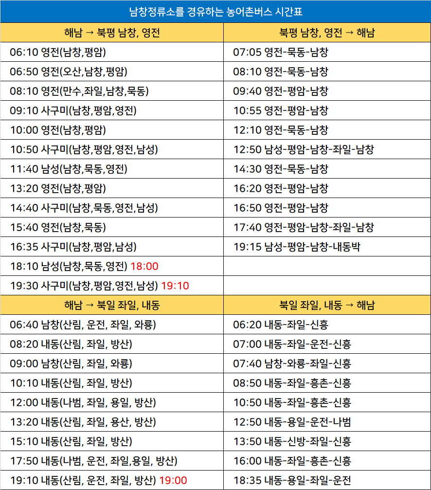 남리시외버스정류소 시간표 [남리시외버스정류장 남리정류소 남리정류장 황산면터미널 우항리터미널 시등로터미널] (0) | 2025.03.22 |