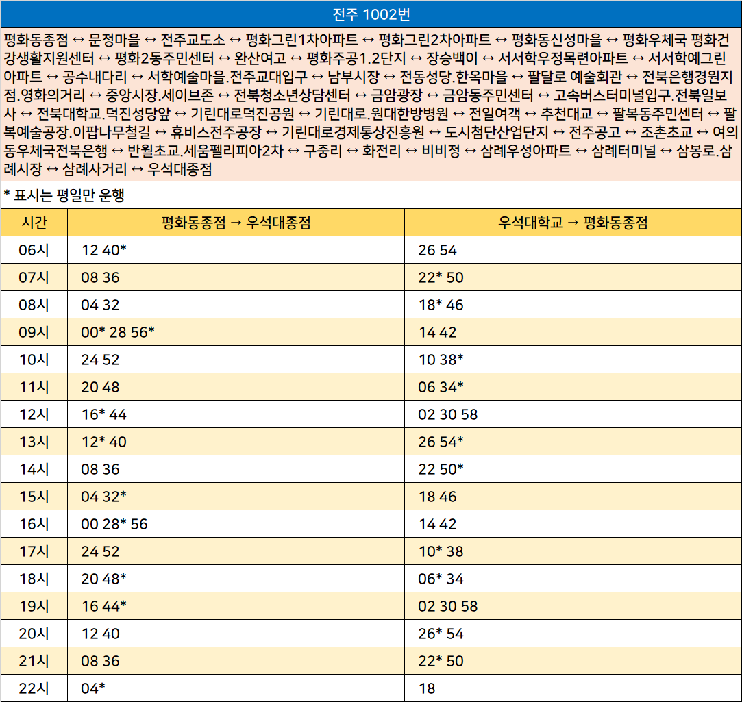 전주 1002번: 평화동종점 ↔ 문정마을 ↔ 전주교도소 ↔ 평화그린1차아파트 ↔ 평화그린2차아파트 ↔ 평화동신성마을 ↔ 평화우체국 평화건강생활지원센터 ↔ 평화2동주민센터 ↔ 완산여고 ↔ 평화주공1.2단지 ↔ 장승백이 ↔ 서서학우정목련아파트 ↔ 서서학예그린아파트 ↔ 공수내다리 ↔ 서학예술마을.전주교대 ↔ 남부시장 ↔ 전동성당.한옥마을 ↔ 팔달로 예술회관 ↔ 전북은행경원지점.영화의거리 ↔ 중앙시장.세이브존 ↔ 전북청소년상담센터 ↔ 금암광장 ↔ 금암동주민센터 ↔ 고속터미널.전북일보사 ↔ 전북대학교.덕진성당앞 ↔ 기린대로덕진공원 ↔ 기린대로.원대한방병원 ↔ 전일여객 ↔ 추천대교 ↔ 팔복동주민센터 ↔ 팔복예술공장.이팝나무철길 ↔ 휴비스전주공장 ↔ 기린대로경제통상진흥원 ↔ 도시첨단산업단지 ↔ 전주공고 ↔ 조촌초교 ↔ 여의동우체국전북은행 ↔ 반월초교.세움펠리피아2차 ↔ 구중리 ↔ 화전리 ↔ 비비정 ↔ 삼례우성아파트 ↔ 삼례터미널 ↔ 삼봉로.삼례시장 ↔ 삼례사거리 ↔ 우석대종점