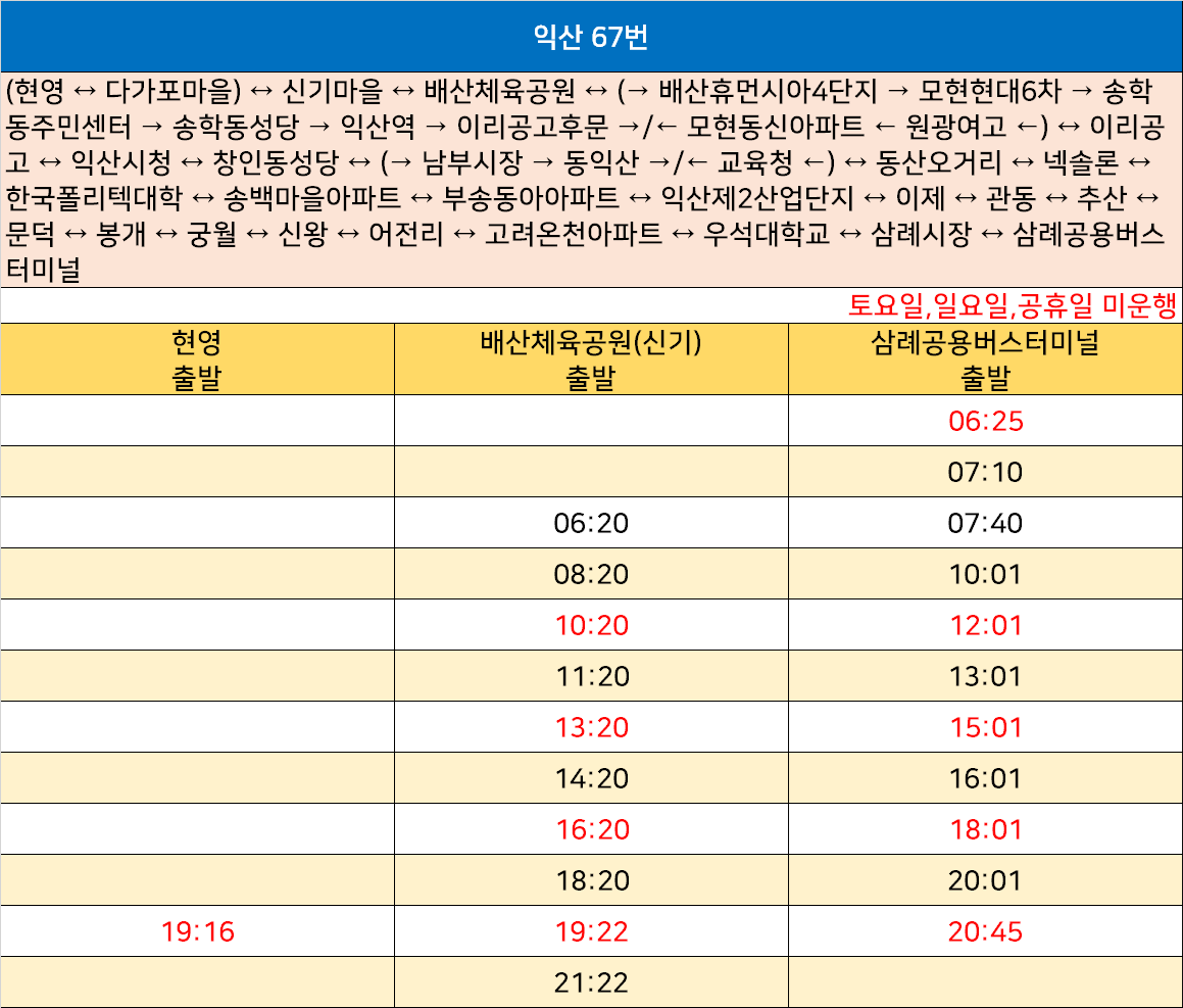 익산 67번: (현영 ↔ 다가포마을) ↔ 신기마을 ↔ 배산체육공원 ↔ (→ 배산휴먼시아4단지 → 모현현대6차 → 송학동주민센터 → 송학동성당 → 익산역 → 이리공고후문 →/← 모현동신아파트 ← 원광여고 ←) ↔ 이리공고 ↔ 익산시청 ↔ 창인동성당 ↔ (→ 남부시장 → 동익산 →/← 교육청 ←) ↔ 동산오거리 ↔ 넥솔론 ↔ 한국폴리텍대학 ↔ 송백마을아파트 ↔ 부송동아아파트 ↔ 익산제2산업단지 ↔ 이제 ↔ 관동 ↔ 추산 ↔ 문덕 ↔ 봉개 ↔ 궁월 ↔ 신왕 ↔ 어전리 ↔ 고려온천아파트 ↔ 우석대학교 ↔ 삼례시장 ↔ 삼례공용버스터미널