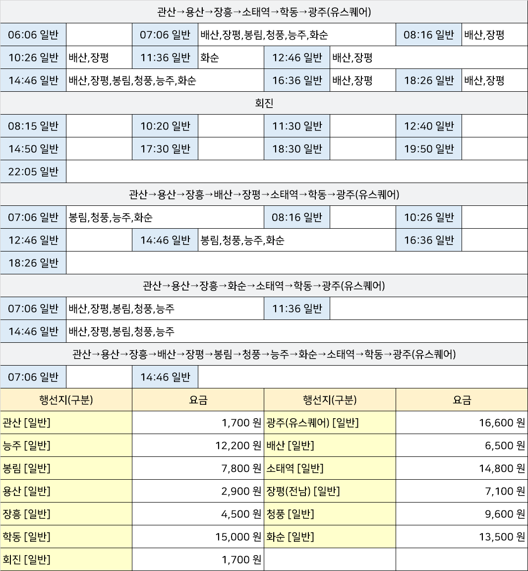 대덕공용시외고속버스터미널 대덕정류장 대덕정류소 → "관산→용산→장흥→배산→장평→봉림→청풍→능주→화순→소태역→학동→광주(유스퀘어),관산→용산→장흥→배산→장평→소태역→학동→광주(유스퀘어),관산→용산→장흥→소태역→학동→광주(유스퀘어),관산→용산→장흥→화순→소태역→학동→광주(유스퀘어),회진".