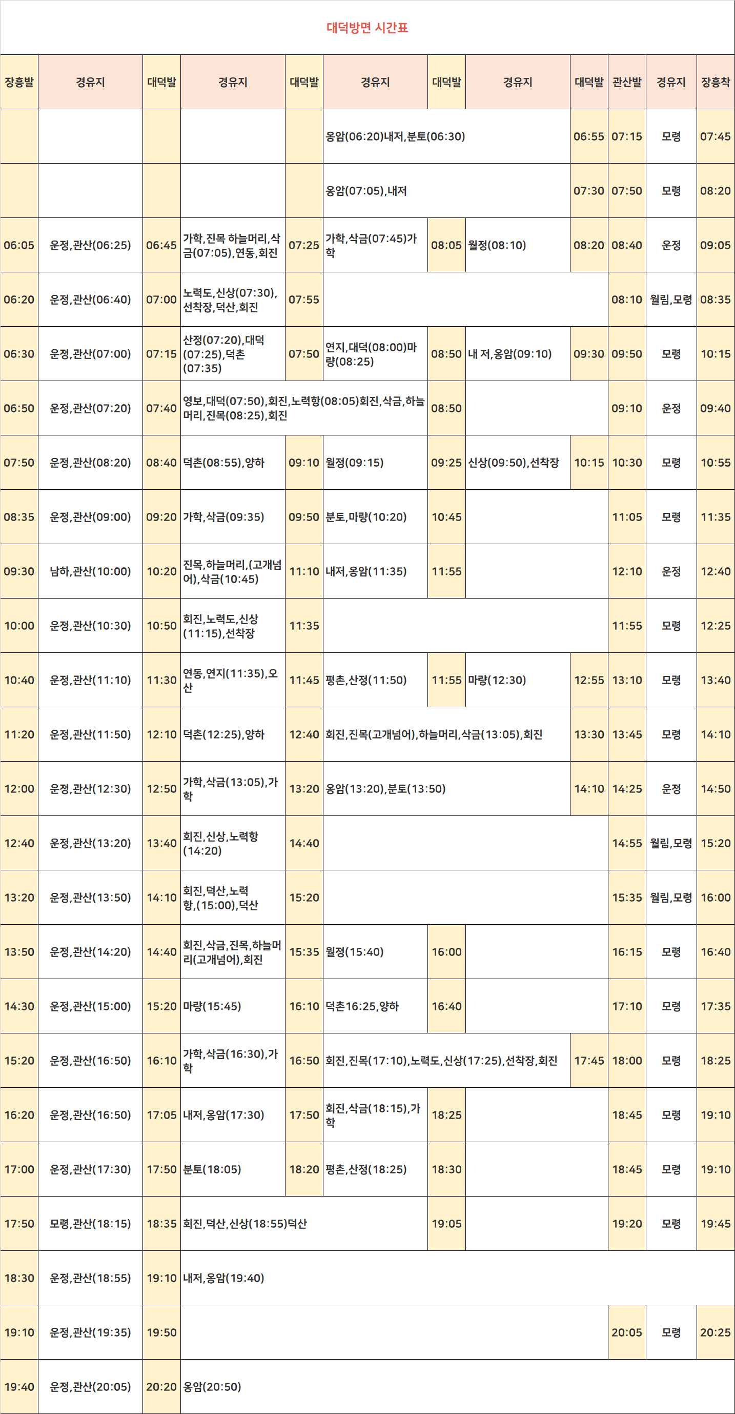 대덕방면 노선정보: 가학, 고개넘어, 관산, 남하, 내저, 노력도, 노력항, 대덕, 덕산, 덕촌, 마량, 모령, 분토, 삭금, 산정, 선착장, 신상, 양하, 연동, 연지, 영보, 오산, 옹암, 운정, 월림, 월정, 장흥, 진목, 평촌, 하늘머리, 하늘머리고개넘어, 회진