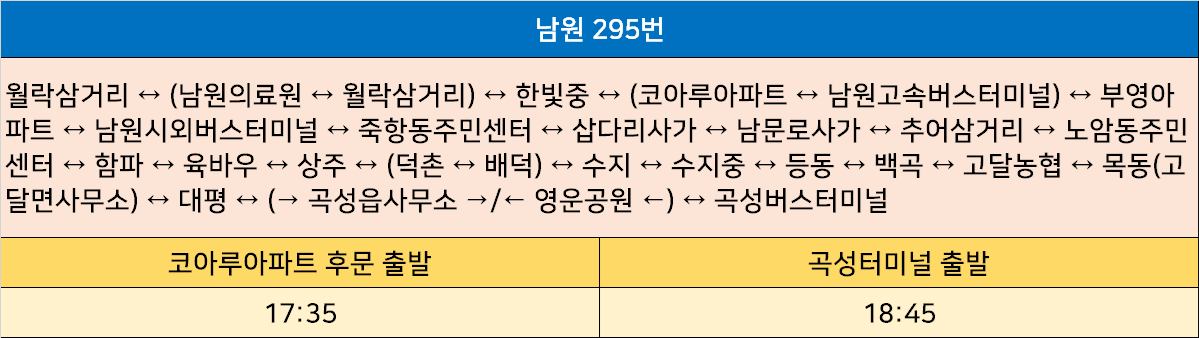 남원 295번: 월락삼거리 ↔ (남원의료원 ↔ 월락삼거리) ↔ 한빛중 ↔ (코아루아파트 ↔ 남원고속버스터미널) ↔ 부영아파트 ↔ 남원시외버스터미널 ↔ 죽항동주민센터 ↔ 삽다리사가 ↔ 남문로사가 ↔ 추어삼거리 ↔ 노암동주민센터 ↔ 함파 ↔ 육바우 ↔ 상주 ↔ (덕촌 ↔ 배덕) ↔ 수지 ↔ 수지중 ↔ 등동 ↔ 백곡 ↔ 고달농협 ↔ 목동(고달면사무소) ↔ 대평 ↔ (→ 곡성읍사무소 →/← 영운공원 ←) ↔ 곡성버스터미널