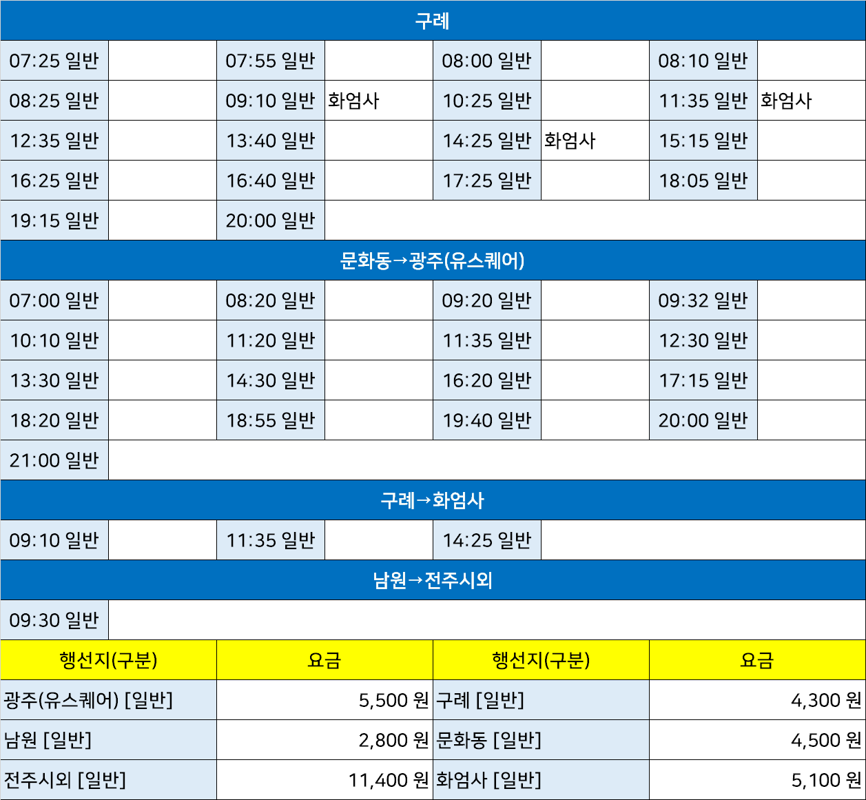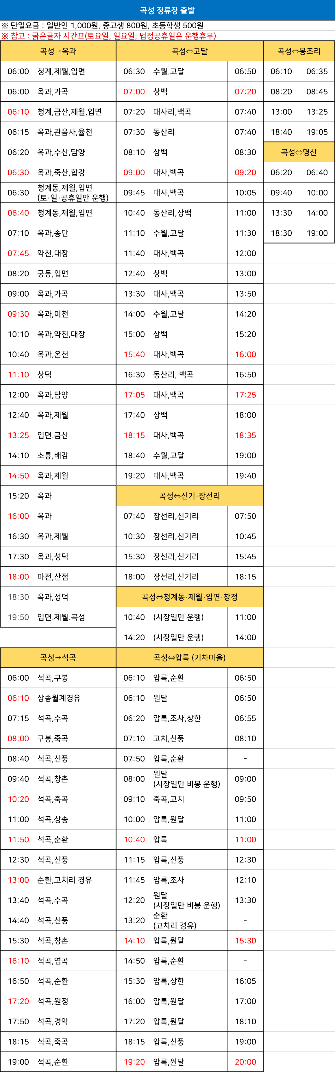 곡성 시외버스 터미널 시간표/요금표 2025년 03월 03일 기준