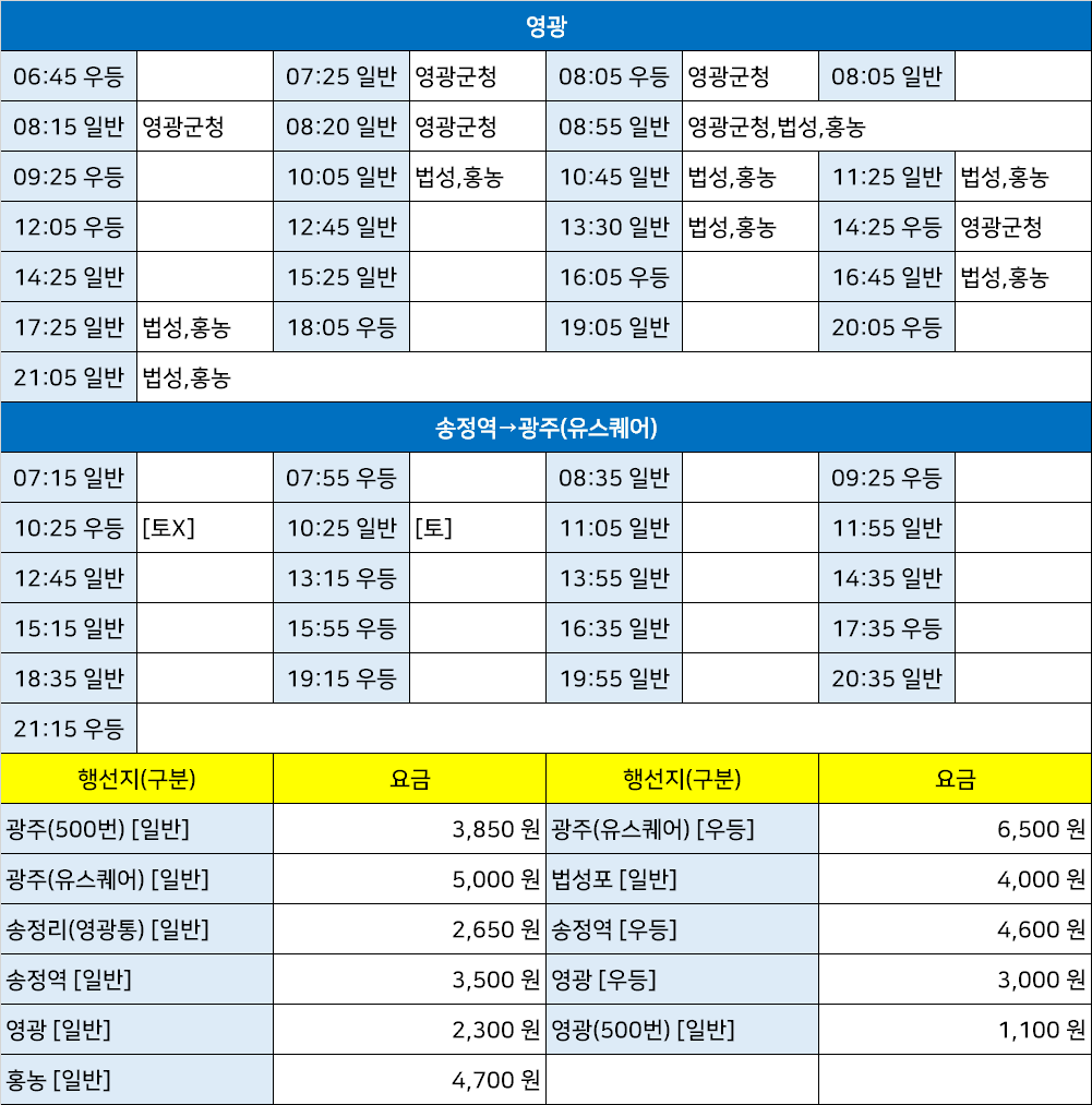 문장공영종합시외고속버스터미널 문장정류장 문장정류소 → "법성,송정역→광주(유스퀘어),영광,영광군청,홍농".