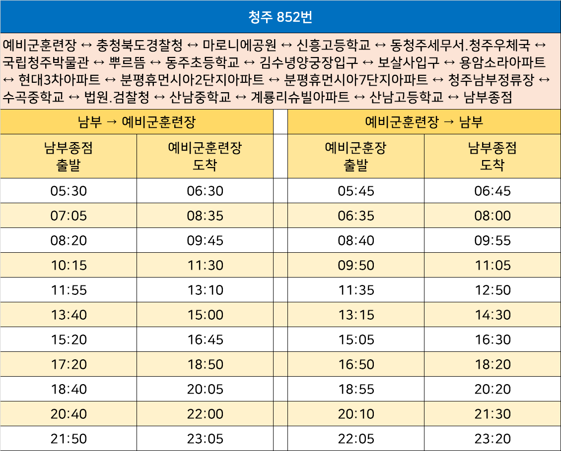 청주 852번: 예비군훈련장 ↔ 충청북도경찰청 ↔ 마로니에공원 ↔ 신흥고등학교 ↔ 동청주세무서.청주우체국 ↔ 국립청주박물관 ↔ 뿌르뜸 ↔ 동주초등학교 ↔ 김수녕양궁장입구 ↔ 보살사입구 ↔ 용암소라아파트 ↔ 현대3차아파트 ↔ 분평휴먼시아2단지아파트 ↔ 분평휴먼시아7단지아파트 ↔ 청주남부정류장 ↔ 수곡중학교 ↔ 법원.검찰청 ↔ 산남중학교 ↔ 계룡리슈빌아파트 ↔ 산남고등학교 ↔ 남부종점