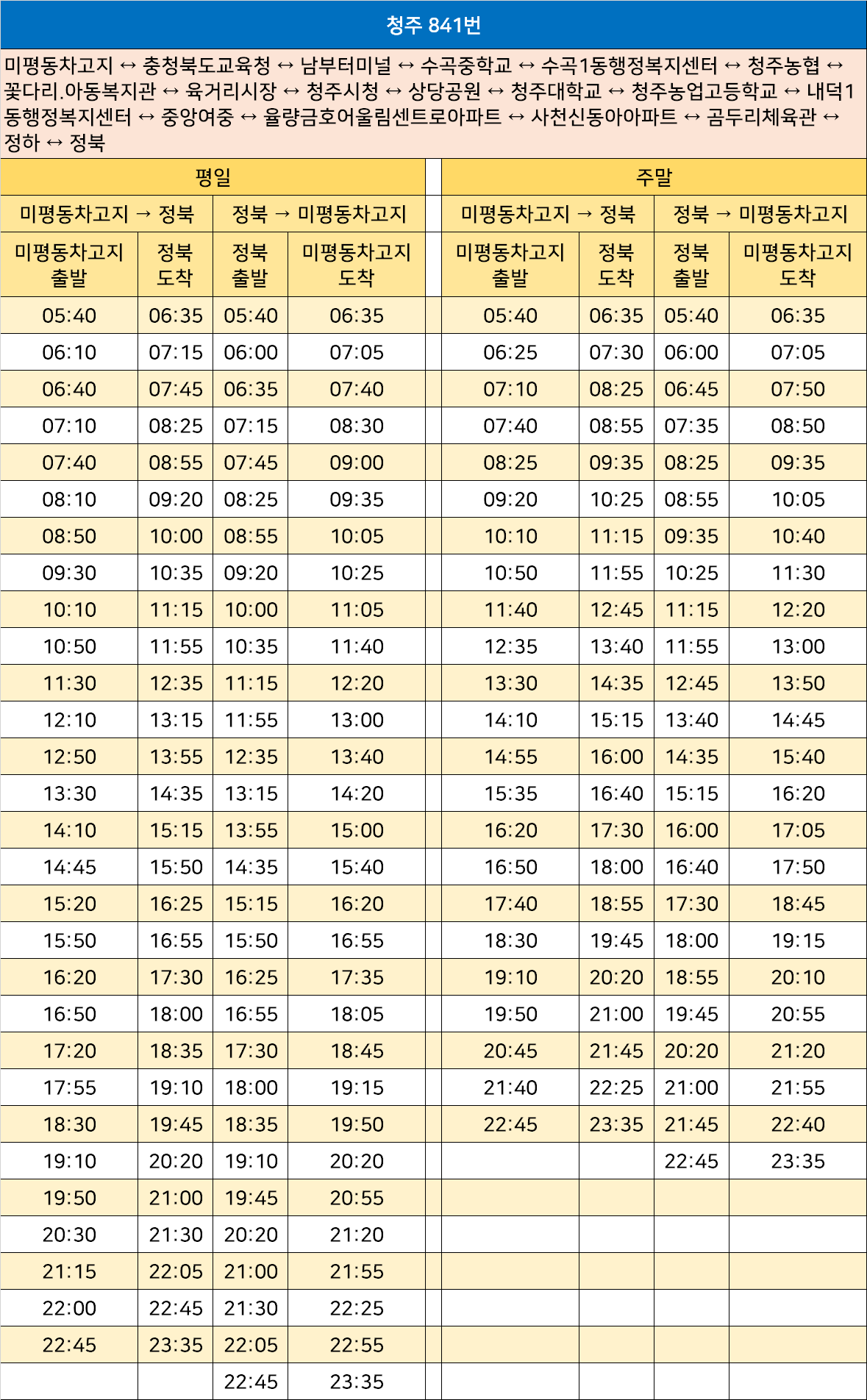 청주 841번: 미평동차고지 ↔ 충청북도교육청 ↔ 남부터미널 ↔ 수곡중학교 ↔ 수곡1동행정복지센터 ↔ 청주농협 ↔ 꽃다리.아동복지관 ↔ 육거리시장 ↔ 청주시청 ↔ 상당공원 ↔ 청주대학교 ↔ 청주농업고등학교 ↔ 내덕1동행정복지센터 ↔ 중앙여중 ↔ 율량금호어울림센트로아파트 ↔ 사천신동아아파트 ↔ 곰두리체육관 ↔ 정하 ↔ 정북