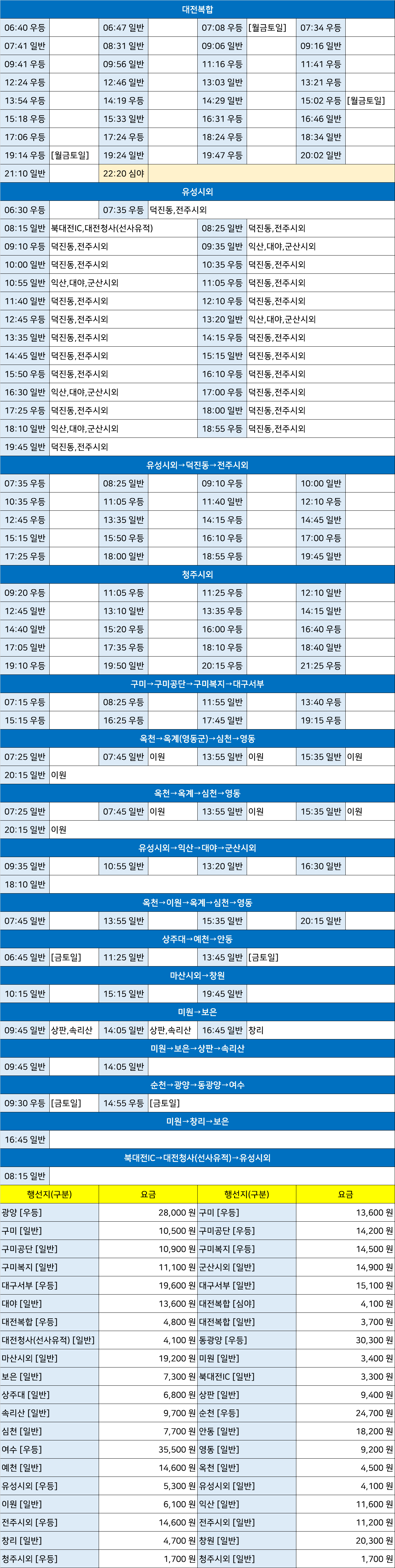청주남부 시외버스 정류장 시간표/요금표 2025년 03월 04일 기준