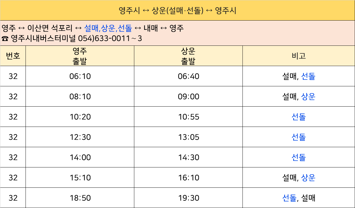 영주 ↔ 이산면 석포리 ↔ 설매,상운,선돌 ↔ 내매 ↔ 영주