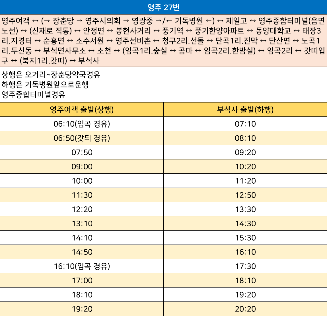 영주 27번: 영주여객 ↔ (→ 장춘당 → 영주시의회 → 영광중 →/← 기독병원 ←) ↔ 제일고 ↔ 영주종합터미널(읍면노선) ↔ (신재로 직통) ↔ 안정면 ↔ 봉현사거리 ↔ 풍기역 ↔ 풍기한양아파트 ↔ 동양대학교 ↔ 태장3리.지경터 ↔ 순흥면 ↔ 소수서원 ↔ 영주선비촌 ↔ 청구2리.선돌 ↔ 단곡1리.진막 ↔ 단산면 ↔ 노곡1리.두신동 ↔ 부석면사무소 ↔ 소천 ↔ (임곡1리.숲실 ↔ 곰마 ↔ 임곡2리.한밤실) ↔ 임곡2리 ↔ 갓띠입구 ↔ (북지1리.갓띠) ↔ 부석사