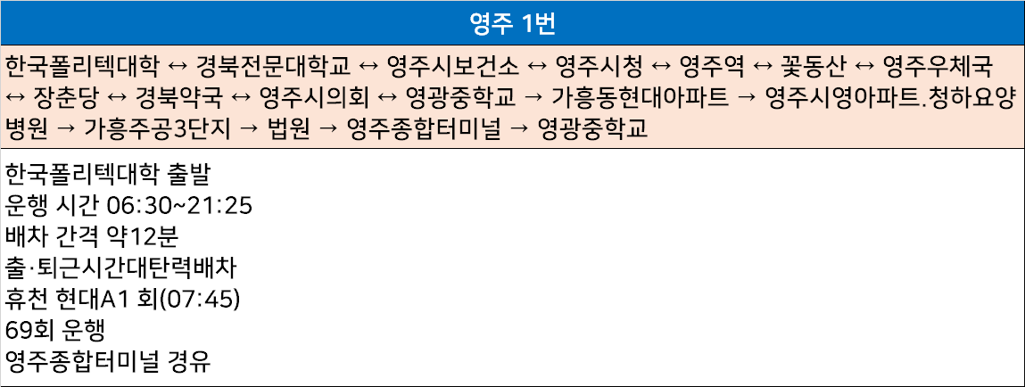 영주 1번: 한국폴리텍대학 ↔ 경북전문대학교 ↔ 영주시보건소 ↔ 영주시청 ↔ 영주역 ↔ 꽃동산 ↔ 영주우체국 ↔ 장춘당 ↔ 경북약국 ↔ 영주시의회 ↔ 영광중학교 → 가흥동현대아파트 → 영주시영아파트.청하요양병원 → 가흥주공3단지 → 법원 → 영주종합터미널 → 영광중학교