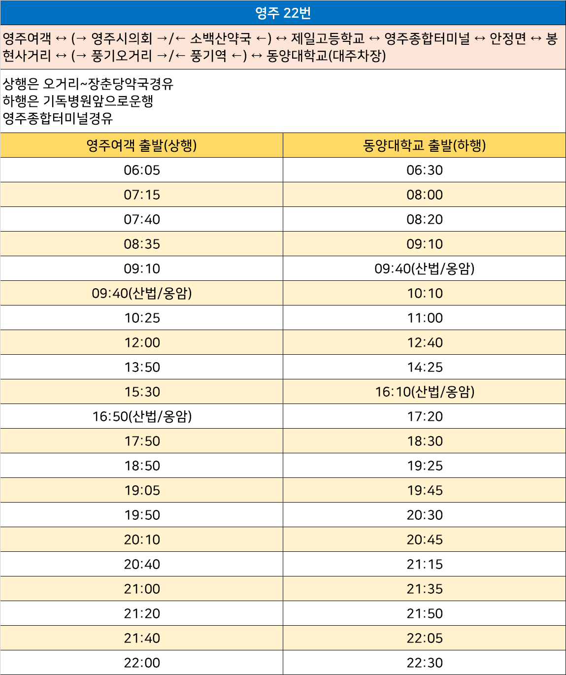 영주 22번: 영주여객 ↔ (→ 영주시의회 →/← 소백산약국 ←) ↔ 제일고등학교 ↔ 영주종합터미널 ↔ 안정면 ↔ 봉현사거리 ↔ (→ 풍기오거리 →/← 풍기역 ←) ↔ 동양대학교(대주차장)