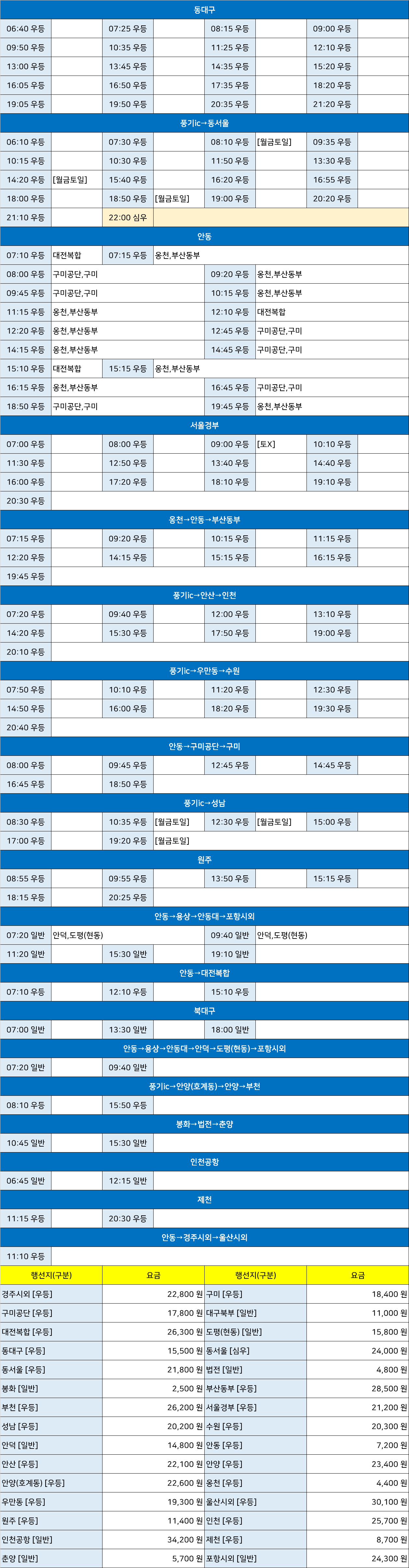 영주종합시외고속버스터미널 영주터미널 → "동대구,봉화→법전→춘양,북대구,서울경부,안동→경주시외→울산시외,안동→구미공단→구미,안동→대전,안동→용상→안동대→안덕→도평(현동)→포항시외,안동→용상→안동대→포항시외,옹천→안동→부산동부,원주,인천공항,제천,풍기ic→동서울,풍기ic→성남,풍기ic→안산→인천,풍기ic→우만동→수원,풍기ic→호계동→안양→부천".