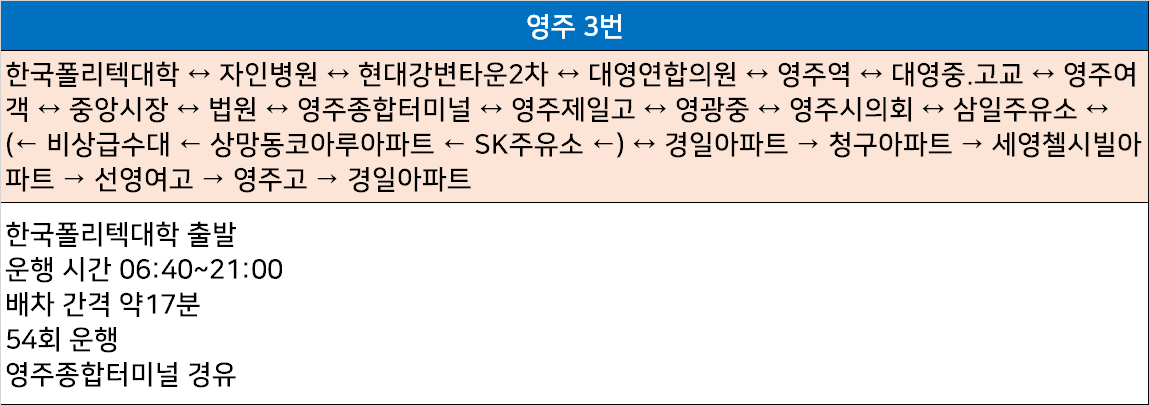 영주 3번: 한국폴리텍대학 ↔ 자인병원 ↔ 현대강변타운2차 ↔ 대영연합의원 ↔ 영주역 ↔ 대영중.고교 ↔ 영주여객 ↔ 중앙시장 ↔ 법원 ↔ 영주종합터미널 ↔ 영주제일고 ↔ 영광중 ↔ 영주시의회 ↔ 삼일주유소 ↔ (← 비상급수대 ← 상망동코아루아파트 ← SK주유소 ←) ↔ 경일아파트 → 청구아파트 → 세영첼시빌아파트 → 선영여고 → 영주고 → 경일아파트