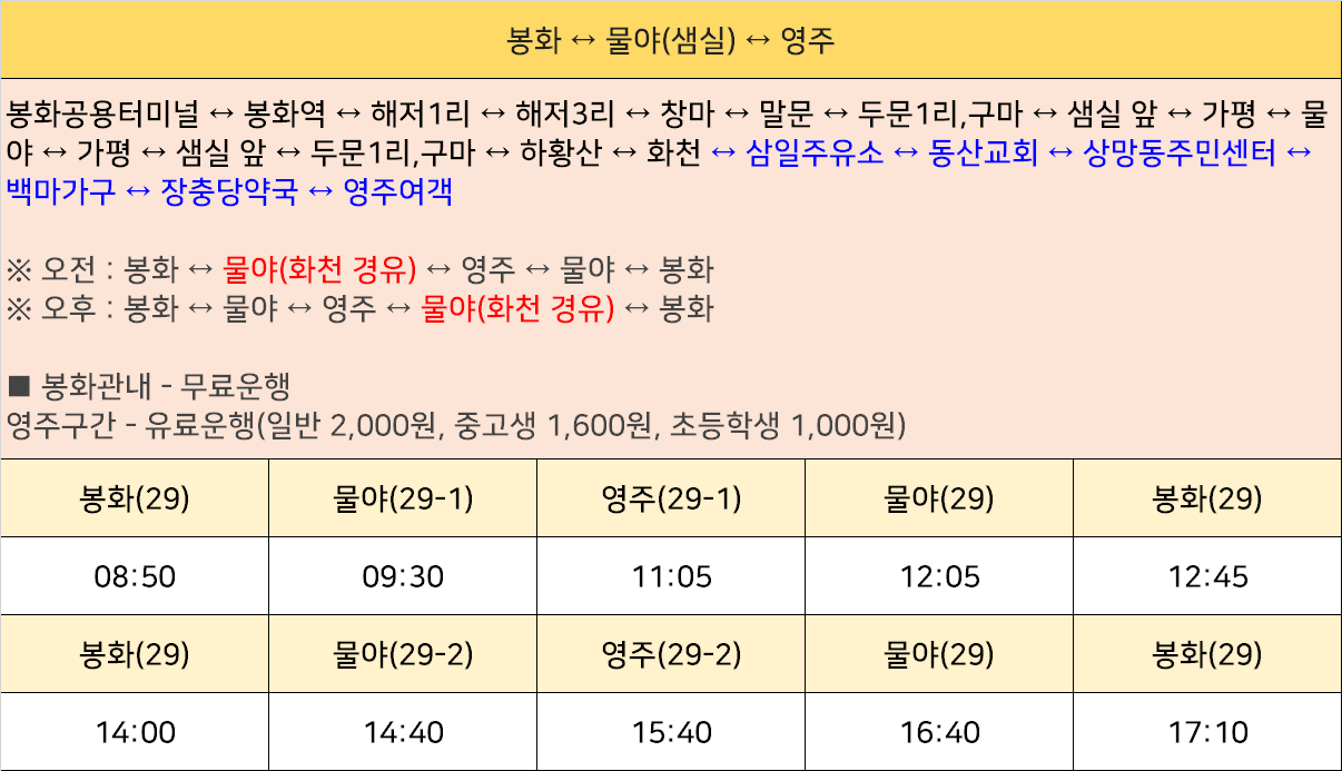 봉화 ↔ 물야(샘실) ↔ 영주 버스: