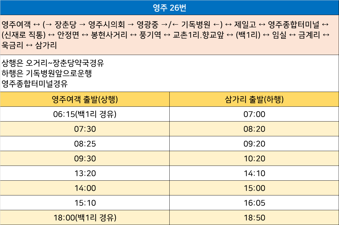 영주 26번: 영주여객 ↔ (→ 장춘당 → 영주시의회 → 영광중 →/← 기독병원 ←) ↔ 제일고 ↔ 영주종합터미널 ↔ (신재로 직통) ↔ 안정면 ↔ 봉현사거리 ↔ 풍기역 ↔ 교촌1리.향교앞 ↔ (백1리) ↔ 임실 ↔ 금계리 ↔ 욱금리 ↔ 삼가리