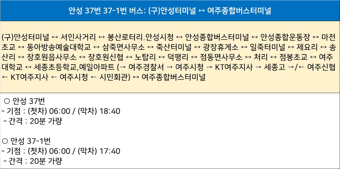 안성 37번 37-1번: (구)안성터미널 ↔ 서인사거리 ↔ 봉산로터리.안성시청 ↔ 안성종합버스터미널 ↔ 안성종합운동장 ↔ 마전초교 ↔ 동아방송예술대학교 ↔ 삼죽면사무소 ↔ 죽산터미널 ↔ 광장휴게소 ↔ 일죽터미널 ↔ 제요리 ↔ 송산리 ↔ 장호원읍사무소 ↔ 장호원신협 ↔ 노탑리 ↔ 덕평리 ↔ 점동면사무소 ↔ 처리 ↔ 점봉초교 ↔ 여주대학교 ↔ 세종초등학교,예일아파트 ( 여주경찰서 → 여주시청 → KT여주지사 → 세종고 → /← 여주신협 ← KT여주지사 ← 여주시청 ← 시민회관) ↔ 여주종합버스터미널