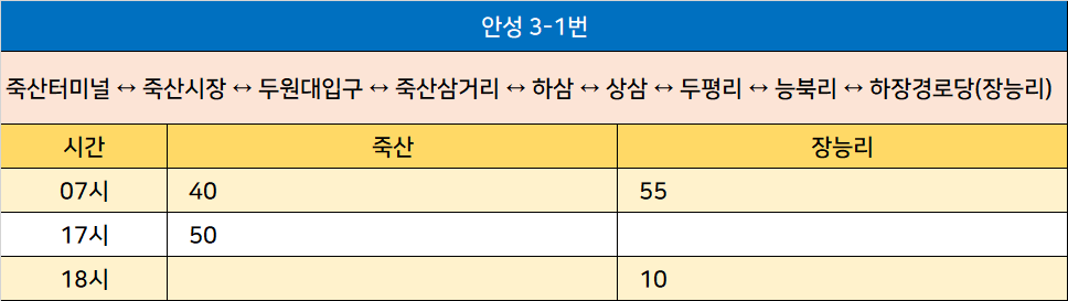 안성 3-1번: 죽산터미널 ↔ 죽산시장 ↔ 두원대입구 ↔ 죽산삼거리 ↔ 하삼 ↔ 상삼 ↔ 두평리 ↔ 능북리 ↔ 하장경로당(장능리)