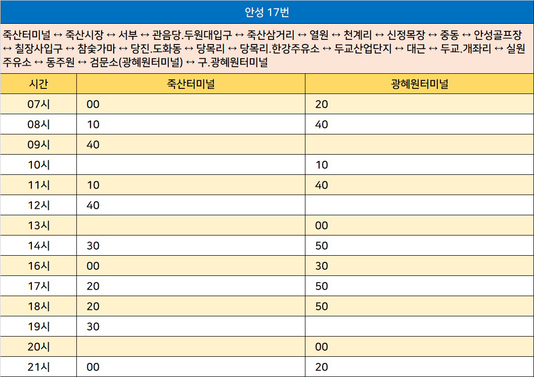 안성 17번: 죽산터미널 ↔ 죽산시장 ↔ 서부 ↔ 관음당.두원대입구 ↔ 죽산삼거리 ↔ 열원 ↔ 천계리 ↔ 신정목장 ↔ 중동 ↔ 안성골프장 ↔ 칠장사입구 ↔ 참숯가마 ↔ 당진.도화동 ↔ 당목리 ↔ 당목리.한강주유소 ↔ 두교산업단지 ↔ 대근 ↔ 두교.개좌리 ↔ 실원주유소 ↔ 동주원 ↔ 검문소(광혜원터미널) ↔ 구.광혜원터미널