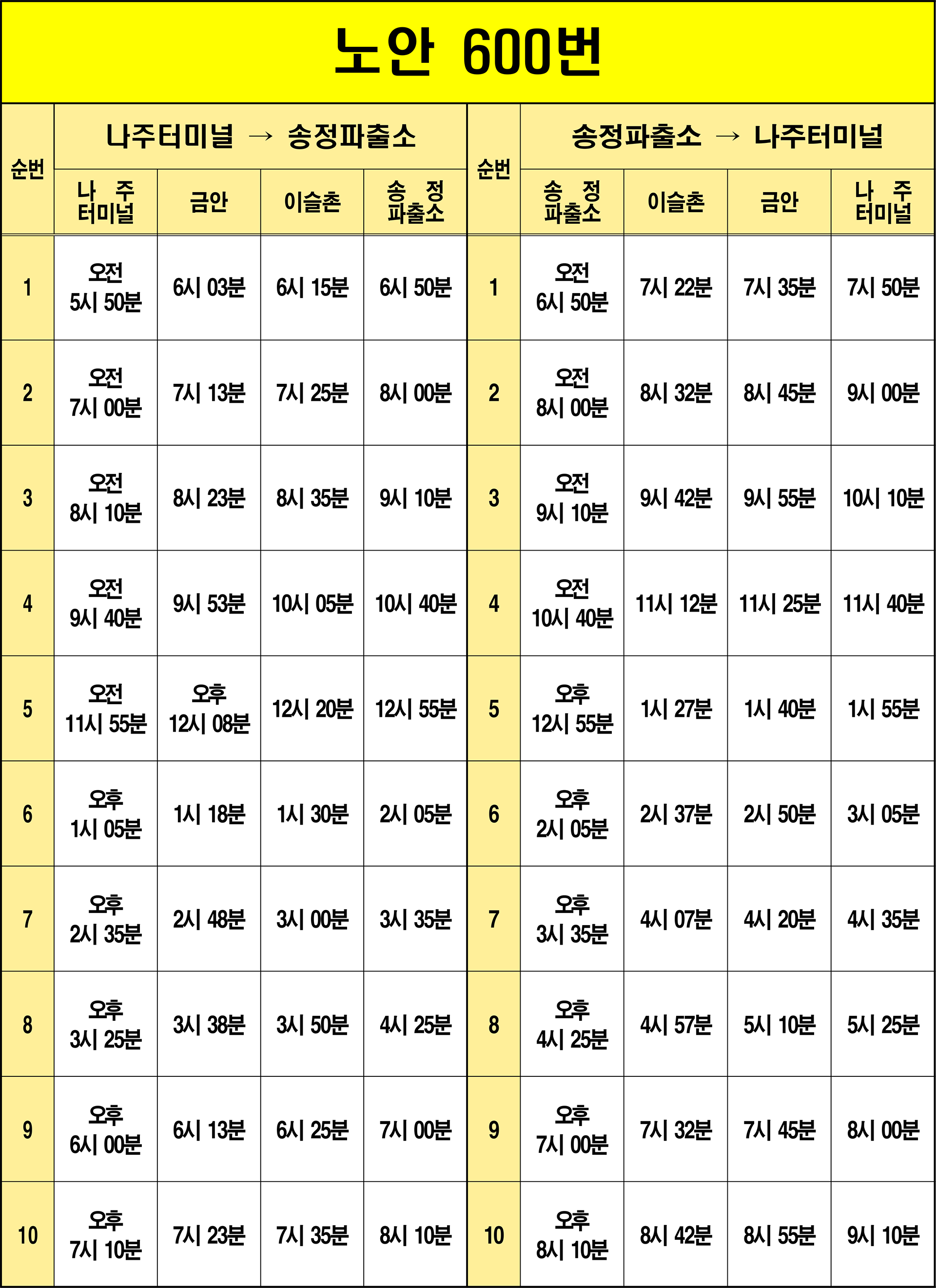 나주 600번: 1. 나주터미널(기점/환승) → 2. 성북아파트 → 3. 구교육청 → 4. 현대아파트정문 → 5. 정렬사 → 6. 싸이클경기장 → 7. 동신대학교 → 8. 동신대학교후문 → 9. 칠전마을입구 → 10. 송계 → 11. 태평사 → 12. 노안부대·4대대입구 → 13. 영안 → 14. 구축 → 15. 금안 → 16. 용산삼거리(환승) → 17. 금곡 → 18. 월정 → 19. 서교 → 20. 오정 → 21. 장등 → 22. 계량 → 23. 이슬촌 → 24. 송학 → 25. 광산유스호스텔 → 26. 신동 → 27. 송학입구 → 28. 대산삼거리 → 29. 대산 → 30. 신광 → 31. 도야 → 32. 회룡(광산구) → 33. 연동 → 34. 월곡마을 → 35. 명동삼거리 → 36. 명화동 → 37. 축산시험장 → 38. 용강입구 → 39. 기곡 → 40. 용곡입구 → 41. 평동초교 → 42. 옥동.평동방부병원 → 43. 평동우체국 → 44. 평동역(동) → 45. 평동역주차장 → 46. 꽃동네 → 47. 장록 → 48. 검문소 → 49. 신덕마을 → 50. 신동사거리 → 51. 광주송정역 → 52. 광산구청 → 53. 영광통 → 54. 송정공원역 → 55. 송정파출소(회차지) → 56. 송정파출소(회차 기점) → 57. 송정공원역 → 58. 영광통 → 59. 광산구청 → 60. 광주송정역 → 61. 신동사거리 → 62. 신덕마을 → 63. 검문소 → 64. 장록 → 65. 꽃동네 → 66. 월전(광산구) → 67. 평동역(서) → 68. 평동우체국 → 69. 옥동 → 70. 평동초교 → 71. 용곡입구 → 72. 기곡 → 73. 용강입구 → 74. 축산시험장 → 75. 명화동 → 76. 명동삼거리 → 77. 월곡마을 → 78. 연동 → 79. 회룡(광산구) → 80. 도야 → 81. 신광(삼도) → 82. 대산 → 83. 대산삼거리 → 84. 송학입구 → 85. 신동 → 86. 광산유스호스텔 → 87. 송학 → 88. 이슬촌 → 89. 계량 → 90. 장등 → 91. 오정 → 92. 서교 → 93. 월정 → 94. 금곡 → 95. 용산삼거리(환승) → 96. 금안 → 97. 구축 → 98. 영안 → 99. 노안부대.4대대입구 → 100. 태평사 → 101. 송계 → 102. 칠전마을입구 → 103. 동신대학교후문 → 104. 동신대학교 → 105. 싸이클경기장 → 106. 정렬사 → 107. 금성고등학교 → 108. 천주교사거리 → 109. 나주중앙병원 → 110. 나주터미널(종점/환승)