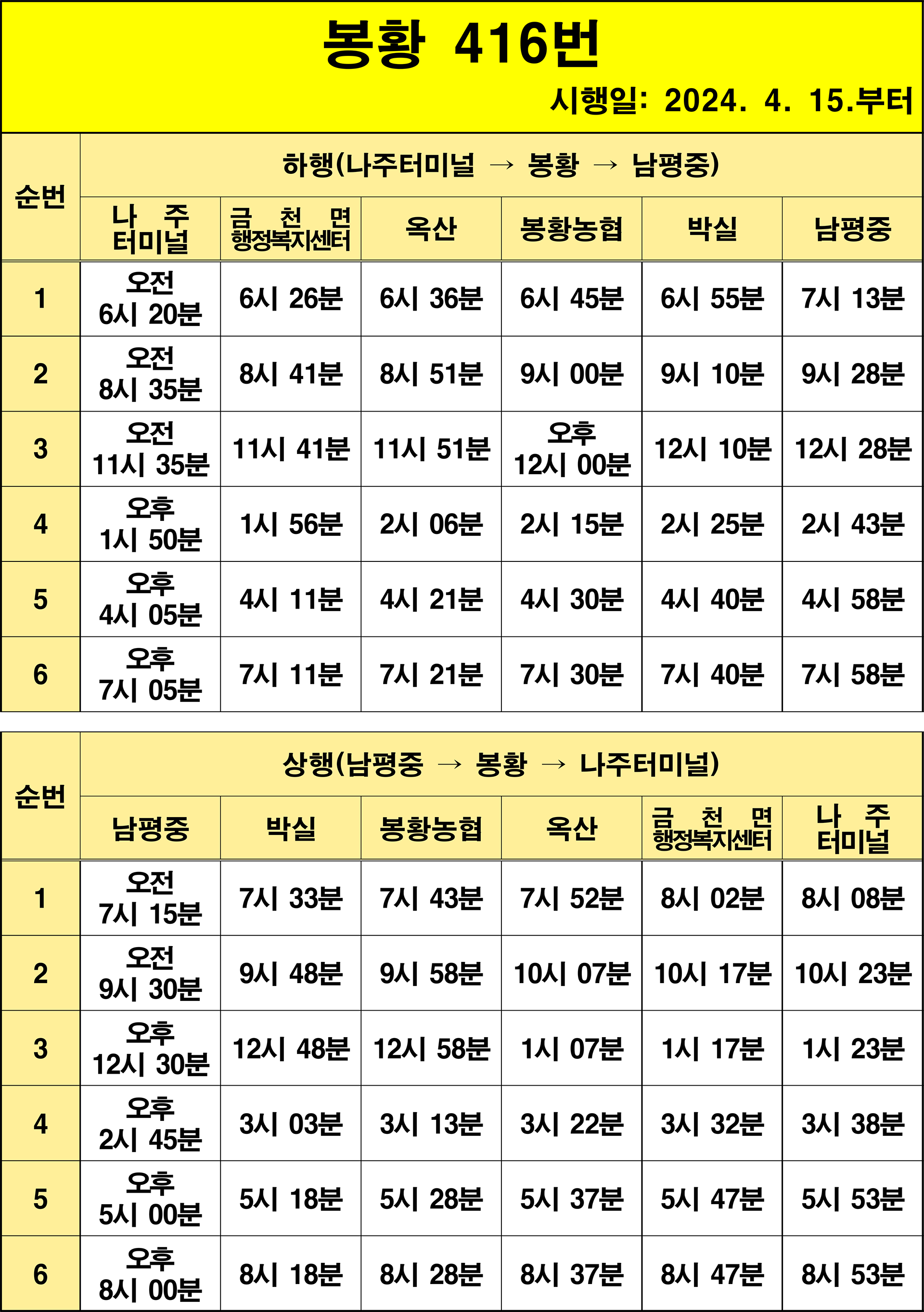 나주 416번: 1.남평중학교(기점) → 2.남평정류장 → 3.남평시장 → 4.연합의원 → 5.교촌마을 → 6.원촌.광남고 → 7.교원삼거리 → 8.방축마을 → 9.남평미래병원 → 10.팔마아파트 → 11.농업기술원 → 12.매화.신흥 → 13.매화동 → 14.식산 → 15.산제 → 16.샛터 → 17.국립나주병원 → 18.도래삼거리 → 19.신도3구 → 20.신도리입구 → 21.박실입구 → 22.박실종점 → 23.샛터 → 24.송현삼거리 → 25.죽석삼거리 → 26.덕흥 → 27.구석삼거리 → 28.봉황면행정복지센터(동) → 29.봉황농협 → 30.봉황면행정복지센터(동) → 31.구석삼거리 → 32.대실 → 33.두함 → 34.두함입구 → 35.관전 → 36.장성 → 37.락동 → 38.옥산보건지소 → 39.옥산 → 40.신갈마을 → 41.갈산 → 42.춘정 → 43.광석 → 44.석동 → 45.자모 → 46.고동 → 47.서고안마을 → 48.연동.세류마을 → 49.금천면행정복지센터 → 50.금천농협 → 51.금천사거리.광탄마을 → 52.원촌 → 53.나주터미널(상행)(회차지) → 54.나주터미널(하행) → 55.교통센터 → 56.미곡 → 57.금천사거리.광탄마을 → 58.금천농협 → 59.금천면행정복지센터 → 60.연동.세류마을 → 61.서고안마을 → 62.고동 → 63.자모 → 64.석동 → 65.광석 → 66.춘정 → 67.갈산 → 68.신갈마을 → 69.옥산 → 70.옥산보건지소 → 71.락동 → 72.장성 → 73.관전 → 74.두함입구 → 75.두함 → 76.대실 → 77.구석삼거리 → 78.봉황면행정복지센터(동) → 79.봉황농협 → 80.봉황면행정복지센터(동) → 81.구석삼거리 → 82.덕흥 → 83.죽석삼거리 → 84.송현삼거리 → 85.샛터 → 86.박실종점 → 87.박실입구 → 88.신도리입구 → 89.신도3구 → 90.도래삼거리 → 91.국립나주병원 → 92.샛터 → 93.산제 → 94.식산 → 95.매화동 → 96.매화.신흥 → 97.농업기술원 → 98.팔마아파트 → 99.남평미래병원 → 100.방축마을 → 101.교원삼거리 → 102.원촌.광남고 → 103.교촌마을 → 104.연합의원 → 105.남평시장 → 106.남평정류장 → 107.남평중학교(종점)