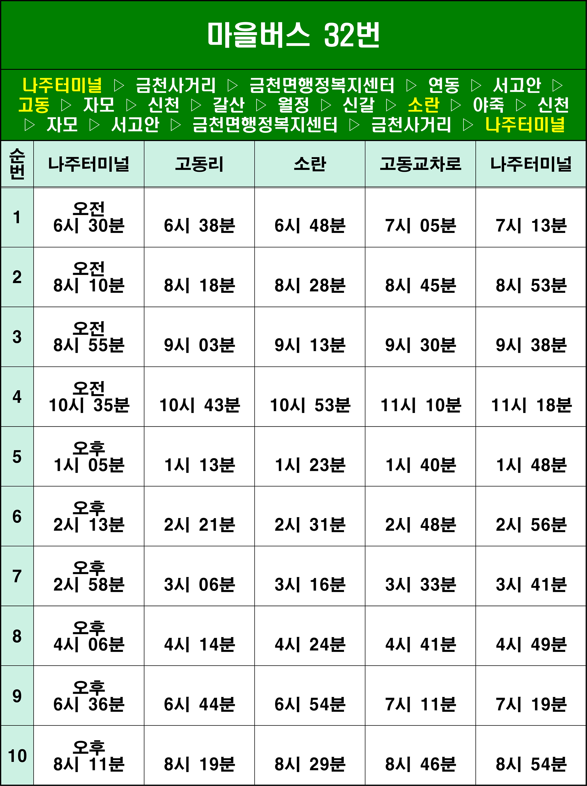 나주 32번: 1. 나주터미널(기점/환승)→ 2. 교통센터 → 3. 미곡 → 4. 금천사거리.광탄마을(환승) → 5. 금천농협 → 6. 금천면행정복지센터 → 7. 연동.세류마을 → 8. 서고안마을 → 9. 고동 → 10. 자모 → 11. 석동 → 12. 광석 → 13. 춘정 → 14. 갈산 → 15. 월정 → 16. 신갈 → 17. 소란 → 18. 신갈 → 19. 월정 → 20. 신갈마을 → 21. 옥산 → 22. 상촌 → 23. 야죽 → 24. 신방 → 25. 방축 → 26. 신천(환승) → 27. 광석 → 28. 석동 → 29. 자모 → 30. 고동 → 31. 서고안마을 → 32. 연동.세류마을 → 33. 금천면행정복지센터 → 34. 금천농협 → 35. 금천사거리.광탄마을(환승) → 36. 원촌 → 37. 나주터미널(종점/환승)