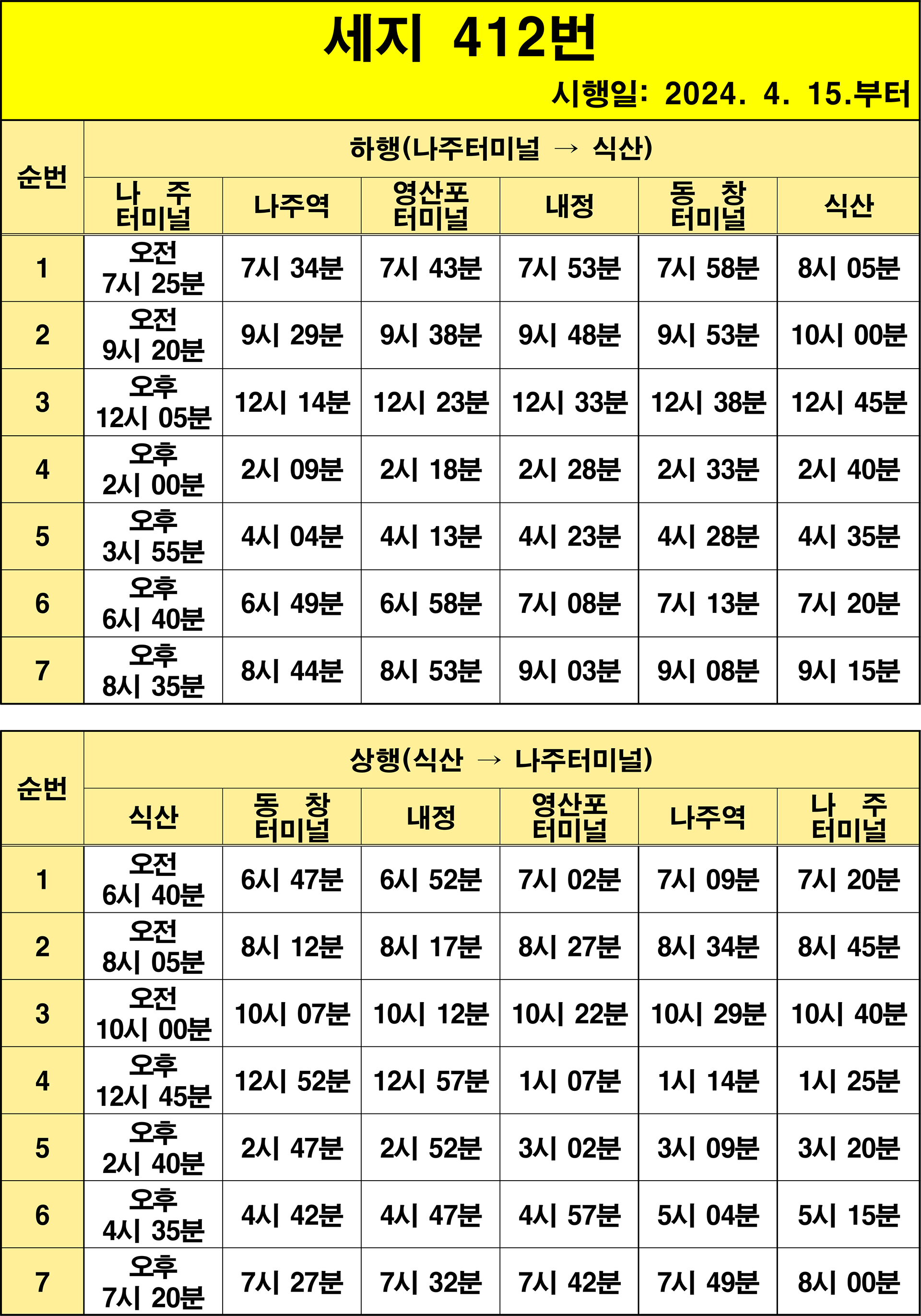 나주 412번: 1.식산종점(기점) → 2.식산 → 3.덕산 → 4.멧계 → 5.벽산 → 6.벽류정 → 7.섬멀 → 8.세지초교 → 9.동창터미널 → 10.대산 → 11.학림 → 12.장치 → 13.내촌 → 14.욱실 → 15.죽산 → 16.용산 → 17.내정 → 18.욱곡리 → 19.송정.부치 → 20.지동 → 21.행복의집(동신) → 22.금계 → 23.작은물 → 24.전남외고 → 25.율정 → 26.영산포터미널(상행) → 27.이창사거리.남교동 → 28.노인복지관 → 29.영강사거리.영산대교 → 30.대덕아파트 → 31.나주국민체육센터 → 32.나주역 → 33.나주시청 → 34.나주문화예술회관 → 35.송월부영아파트 → 36.소방삼거리 → 37.나주고교 → 38.백민원 → 39.천주교사거리 → 40.나주중앙병원 → 41.나주터미널(상행)(회차지) → 42.나주터미널(하행) → 43.성북아파트 → 44.천주교사거리 → 45.나주고교 → 46.소방삼거리 → 47.나주문화예술회관 → 48.흥룡마을입구 → 49.나주시청 → 50.나주역 → 51.나주국민체육센터 → 52.대덕아파트 → 53.영강사거리 → 54.노인복지관 → 55.이창사거리.남교동 → 56.영산포터미널(하행) → 57.용산주공입구 → 58.율정 → 59.용산주공앞 → 60.용산주공2차 → 61.용산주공 → 62.작은물 → 63.금계 → 64.행복의집(동신) → 65.지동 → 66.송정.부치 → 67.욱곡리 → 68.내정 → 69.용산 → 70.죽산 → 71.욱실 → 72.내촌 → 73.장치 → 74.학림 → 75.대산 → 76.동창터미널 → 77.세지초교 → 78.섬멀 → 79.벽류정 → 80.벽산 → 81.멧계 → 82.덕산 → 83.식산 → 84.식산종점(종점)