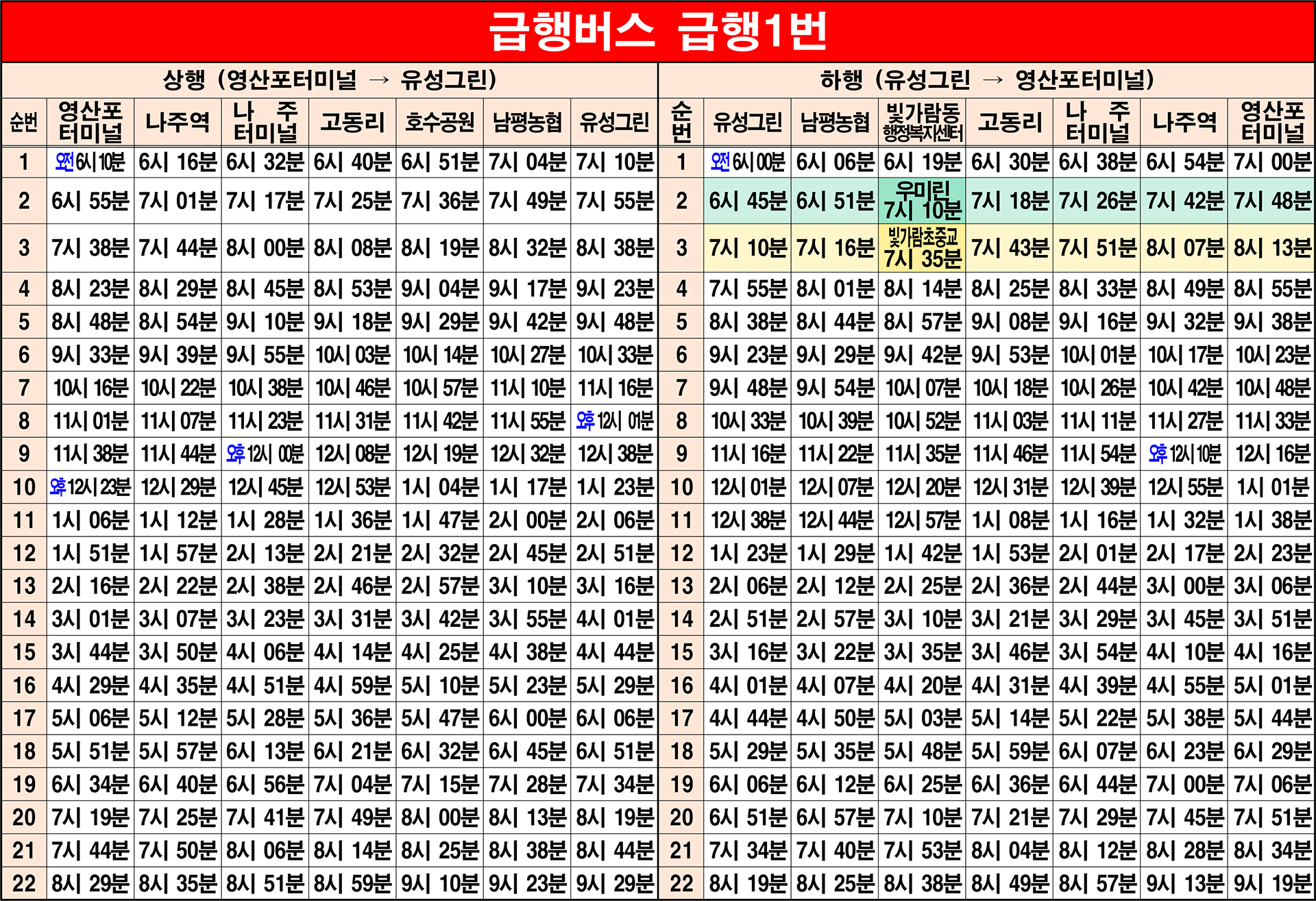 나주 급행1번(우정):※ 통학학생들을 위해 오전 1회만 편도 운행 1. 유성그린(기점) → 2. 남평시장 → 3. 남평농협 → 4. 매성.산포농협 → 5. 실감미디어센터 → 6. 산포농협.하나로마트 → 7. 유전저수지 → 8. 우미린아파트(동) → 9. 한국농촌경제연구원 → 10. 고동 → 11. 금천면행정복지센터 → 12. 금천사거리.광탄마을(환승) → 13. 나주터미널(환승) → 14. 대방아파트 → 15. 금성고등학교 → 16. 나주고교 → 17. 나주문화예술회관 → 18. 나주시청 → 19. 나주역(환승) → 20. 대덕아파트 → 21. 영강사거리 → 22. 영산포터미널(종점/환승)