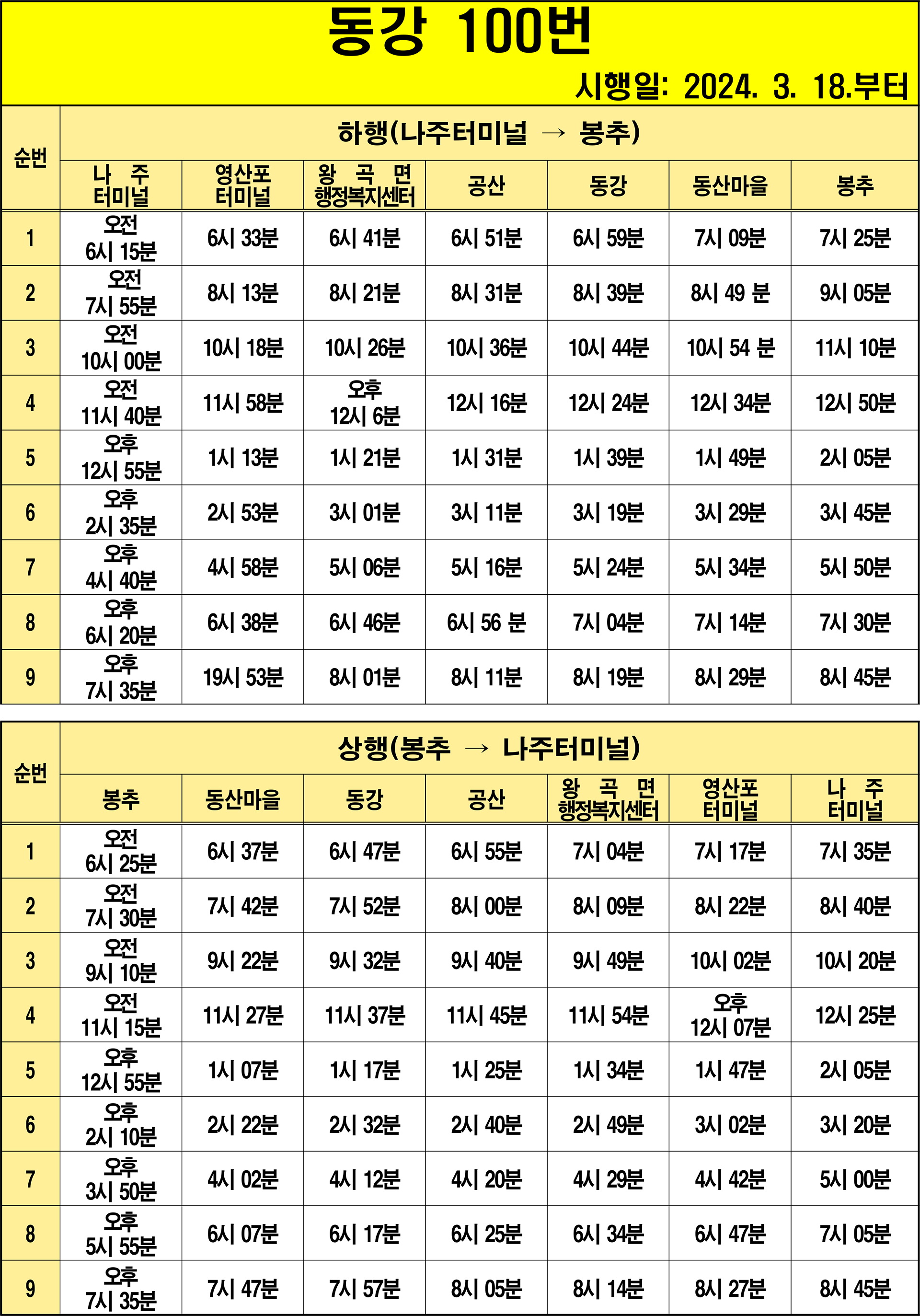 나주 100번: 1.봉추(기점) → 2.신촌 → 3.다복골 → 4.복룡 → 5.화정 → 6.복룡.봉추입구 → 7.옥정 → 8.옥정4구 → 9.몽송 → 10.동산입구 → 11.용동마을 → 12.용동 → 13.월감 → 14.월감마을 → 15.동강남초교.월등 → 16.철산.대전3구 → 17.상촌 → 18.수랑골 → 19.본촌마을 → 20.구양.월량3구 → 21.신양.월량2구 → 22.동강 → 23.월량.후동사거리 → 24.후동 → 25.동촌2구 → 26.동촌.가송입구 → 27.독와실 → 28.송산 → 29.상장성 → 30.공산 → 31.공산고 → 32.복사초리.상방리 → 33.나주C.C.입구 → 34.청송입구 → 35.내동 → 36.박포 → 37.산정 → 38.구천 → 39.왕곡초교 → 40.옥곡 → 41.호동 → 42.왕곡면행정복지센터 → 43.연동 → 44.동방 → 45.동수.오량.농공단지 → 46.동령 → 47.동수동생물산업단지입구 → 48.석계 → 49.석기내 → 50.풍물시장 → 51.나주.광주요양병원 → 52.영산포터미널(상행) → 53.이창사거리.남교동 → 54.노인복지관 → 55.영강사거리.영산대교 → 56.대덕아파트 → 57.나주국민체육센터 → 58.나주역 → 59.나주시청 → 60.나주문화예술회관 → 61.송월부영아파트 → 62.소방삼거리 → 63.나주고교 → 64.백민원 → 65.천주교사거리 → 66.나주중앙병원 → 67.나주터미널(상행)(회차지) → 68.나주터미널(하행) → 69.성북아파트 → 70.천주교사거리 → 71.나주고교 → 72.소방삼거리 → 73.나주문화예술회관 → 74.흥룡마을입구 → 75.나주시청 → 76.나주역 → 77.나주국민체육센터 → 78.대덕아파트 → 79.영강사거리 → 80.노인복지관 → 81.이창사거리.남교동 → 82.영산포터미널(하행) → 83.풍물시장 → 84.석기내 → 85.석계 → 86.동수동생물산업단지입구 → 87.동령 → 88.동수.오량.농공단지 → 89.동방 → 90.연동 → 91.왕곡면행정복지센터 → 92.호동 → 93.옥곡 → 94.왕곡초교 → 95.구천 → 96.산정 → 97.박포 → 98.내동 → 99.청송입구 → 100.나주C.C.입구 → 101.복사초리.상방리 → 102.공산고 → 103.공산 → 104.상장성 → 105.중도 → 106.송산 → 107.독와실 → 108.동촌.가송입구 → 109.동촌2구 → 110.후동 → 111.월량.후동사거리 → 112.동강 → 113.신양.월량2구 → 114.구양.월량3구 → 115.본촌마을 → 116.수랑골 → 117.상촌 → 118.철산.대전3구 → 119.동강남초교.월등 → 120.월감마을 → 121.월감 → 122.용동 → 123.용동마을 → 124.동산입구 → 125.동산마을종점 → 126.몽송 → 127.옥정4구 → 128.옥정 → 129.복룡.봉추입구 → 130.화정 → 131.복룡 → 132.다복골 → 133.신촌 → 134.봉추(종점)