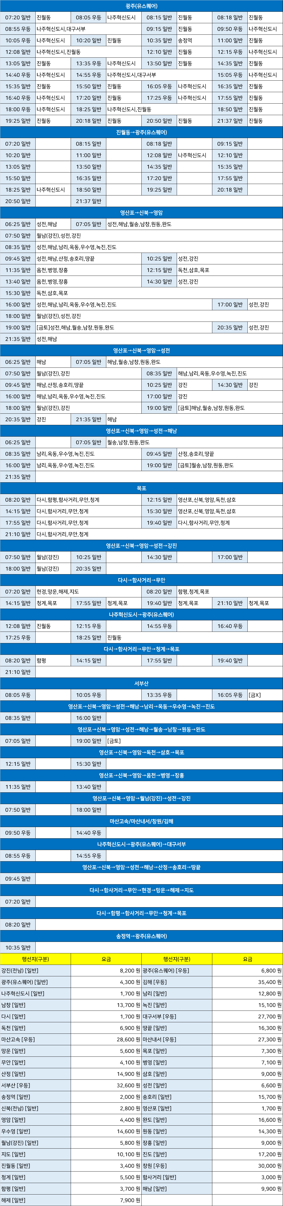 나주 시외버스 터미널 시간표/요금표 2025년 03월 25일 기준
