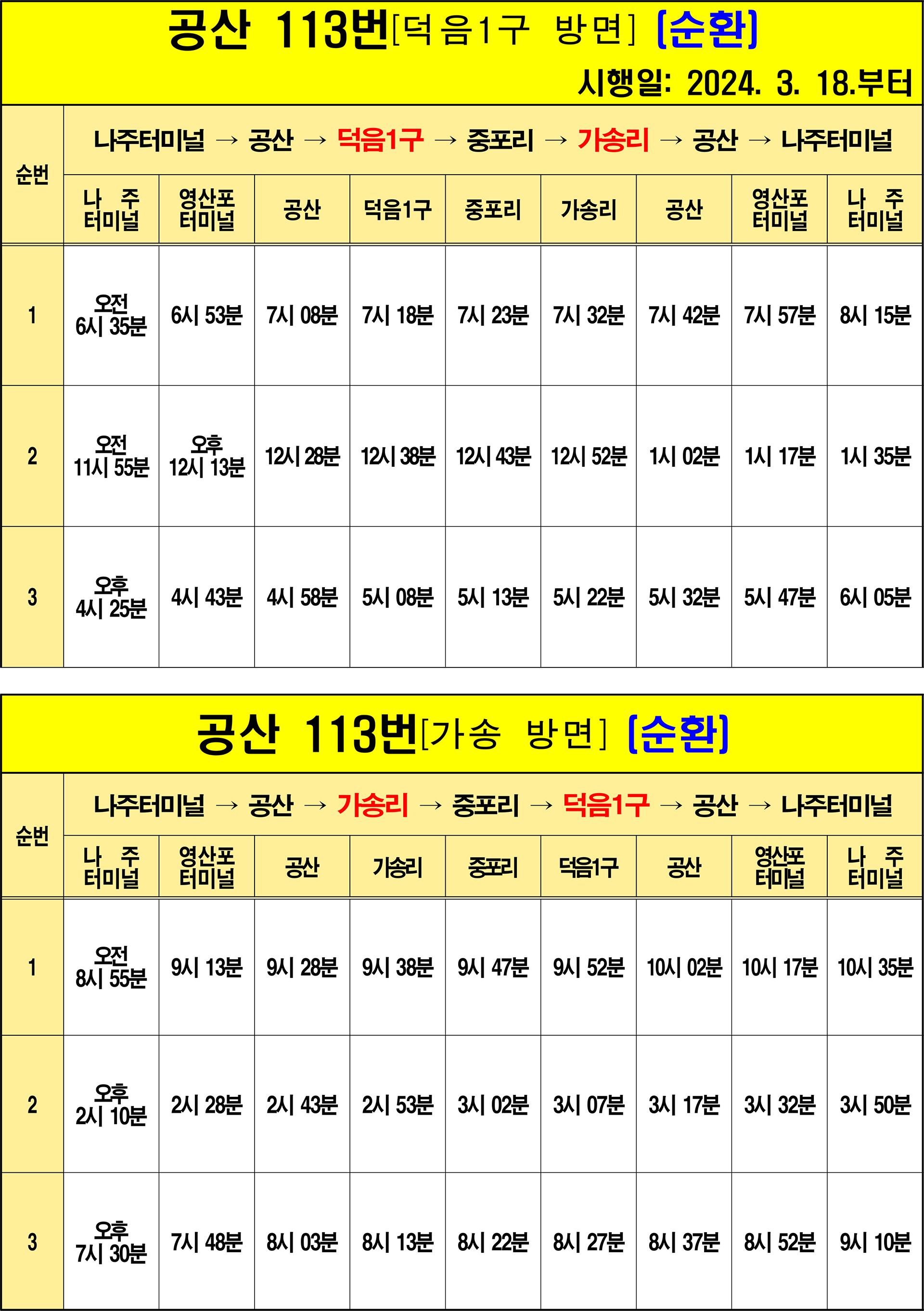 나주 113번(가송리 방면): 1.나주터미널(하행)(기점) → 2.성북아파트 → 3.천주교사거리 → 4.나주고교 → 5.소방삼거리 → 6.나주문화예술회관 → 7.흥룡마을입구 → 8.나주시청 → 9.나주역 → 10.나주국민체육센터 → 11.대덕아파트 → 12.영강사거리 → 13.노인복지관 → 14.이창사거리.남교동 → 15.영산포터미널(하행) → 16.풍물시장 → 17.복사초리.상방리 → 18.공산고 → 19.공산 → 20.상장성 → 21.중도 → 22.송산 → 23.독와실 → 24.동촌1구.송정 → 25.동촌 → 26.가흥 → 27.가송2구 → 28.가송4구 → 29.석계 → 30.가송3구 → 31.중포3구 → 32.중포2구 → 33.중포리.중포1구 → 34.중포2구 → 35.장마.백사2구 → 36.신곡2구회관 → 37.신곡2구 → 38.덕음3구 → 39.덕음2구 → 40.덕음1구 → 41.나주영상테마파크 → 42.사동 → 43.사동.금곡 → 44.남창삼거리 → 45.남창.신흥 → 46.남창 → 47.남창.월호 → 48.하장성 → 49.공산 → 50.공산고 → 51.복사초리.상방리 → 52.풍물시장 → 53.나주.광주요양병원 → 54.영산포터미널(상행) → 55.이창사거리.남교동 → 56.노인복지관 → 57.영강사거리.영산대교 → 58.대덕아파트 → 59.나주국민체육센터 → 60.나주역 → 61.나주시청 → 62.나주문화예술회관 → 63.송월부영아파트 → 64.소방삼거리 → 65.나주고교 → 66.백민원 → 67.천주교사거리 → 68.나주중앙병원 – 69.나주터미널(상행)(종점)