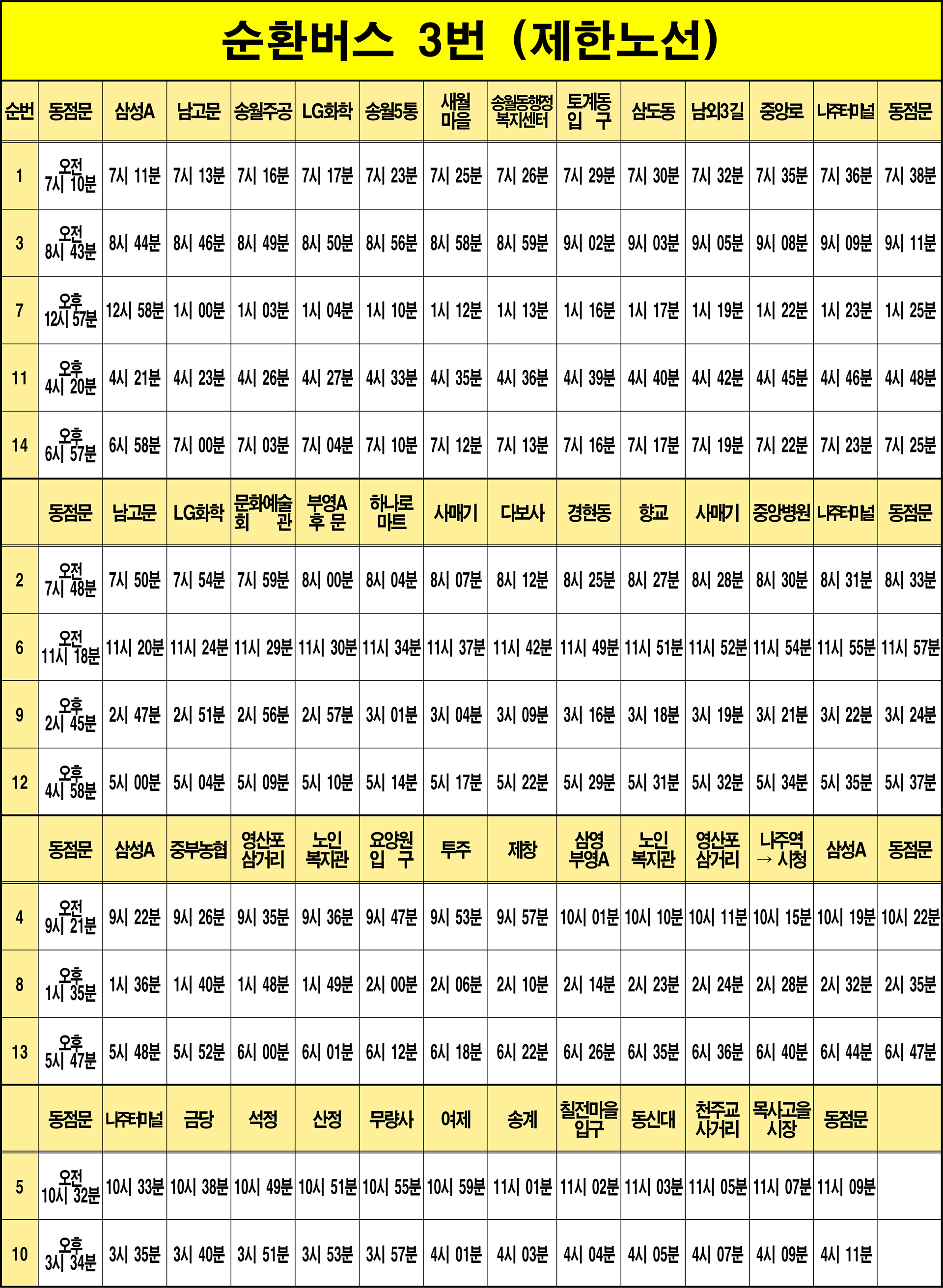 나주 순환3번(원도심): 1. 동점문(기점) → 2. 삼성아파트 → 3. 제일교회 → 4. 남고문(동) → 5. 나주초등학교 → 6. 나주농협 → 7. 송월주공아파트 → 8. LG화학 → 9. KT 나주빌딩 → 10. 나주시청 → 11. 시청정문앞 → 12. 나주시청 → 13. KT 나주빌딩 → 14. 송월5통입구 → 15. 굴다리앞 → 16. 새월마을 → 17. 송월동행정복지센터 → 18. 이화분교입구 → 19. 토계동입구 → 20. 삼도동 → 21. 삼도마을입구 → 22. 남외3길 → 23. 남외1길 → 24. 남고문(서) → 25. 중앙로 → 26. 성북동행정복지센터 → 27. 나주중앙병원 → 28. 나주터미널(환승) → 29. 목사고을시장 → 30. 동점문(종점)