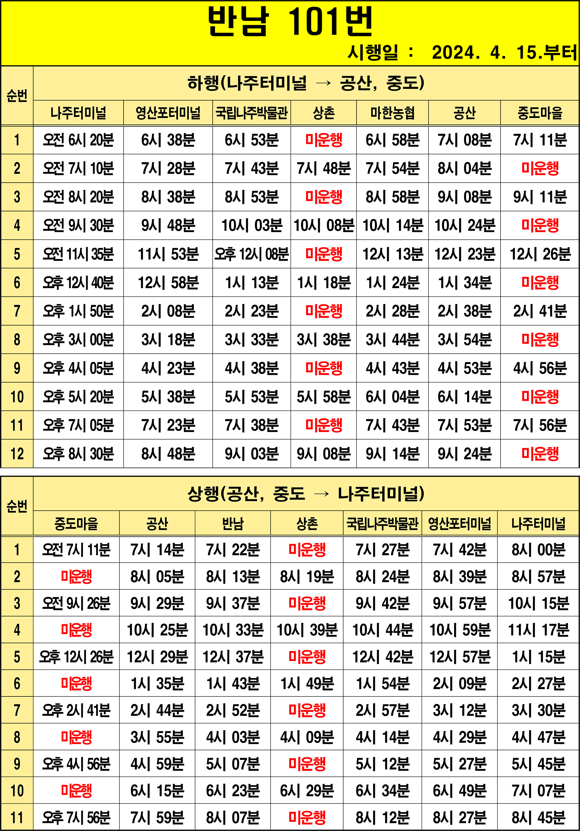 나주 101번(상촌 경유): 1.공산(기점) → 2.공산고 → 3.복사초리.상방리 → 4.구석동 → 5.상방1구 → 6.복용2구 → 7.용연 → 8.구영 → 9.중대 → 10.상대 → 11.마한농협 → 12.석천 → 13.용산마을 → 14.성덕마을 → 15.검환마을 → 16.상촌 17.검환마을 → 18.성덕마을 → 19.월랑 → 20.반남초교.신기 → 21.국립나주박물관 → 22.평촌 → 23.서동 → 24.금동 → 25.원학동 → 26.행전 → 27.평전 → 28.동산 → 29.상사 → 30.양산초교앞 → 31.양산 → 32.천곡 → 33.봉성 → 34.풍물시장 → 35.나주.광주요양병원 → 36.영산포터미널(상행) → 37.이창사거리.남교동 → 38.노인복지관 → 39.영강사거리.영산대교 → 40.대덕아파트 → 41.나주국민체육센터 → 42.나주역 → 43.나주시청(회차지) → 44.나주문화예술회관 → 45.송월부영아파트 → 46.소방삼거리 → 47.나주고교 → 48.백민원 → 49.천주교사거리 → 50.나주중앙병원 → 51.나주터미널(상행) → 52.나주터미널(하행) → 53.성북아파트 → 54.천주교사거리 55.나주고교 → 56.소방삼거리 → 57.나주문화예술회관 →58.흥룡마을입구 →59.나주시청 →60.나주역 →61.나주국민체육센터 → 62.대덕아파트 → 63.영강사거리 → 64.노인복지관 → 65.이창사거리.남교동 → 66.영산포터미널(하행) → 67.풍물시장 → 68.봉성 → 69.천곡 → 70.양산 → 71.양산초교앞 → 72.상사 → 73.동산 → 74.평전 → 75.행전 → 76.원학동 → 77.금동 → 78.서동 → 79.평촌 → 80.국립나주박물관 → 81.반남초교.신기 → 82.월랑 → 83.성덕마을 → 84.검환마을 → 85.상촌 86.검환마을 → 87.성덕마을 → 88.용산마을 → 89.석천 → 90.마한농협 → 91.상대 → 92.중대 → 93.구영 94.용연 → 95.복용2구 → 96.상방1구 → 97.구석동 → 98.복사초리.상방리 → 99.공산고 – 100.공산(종점)