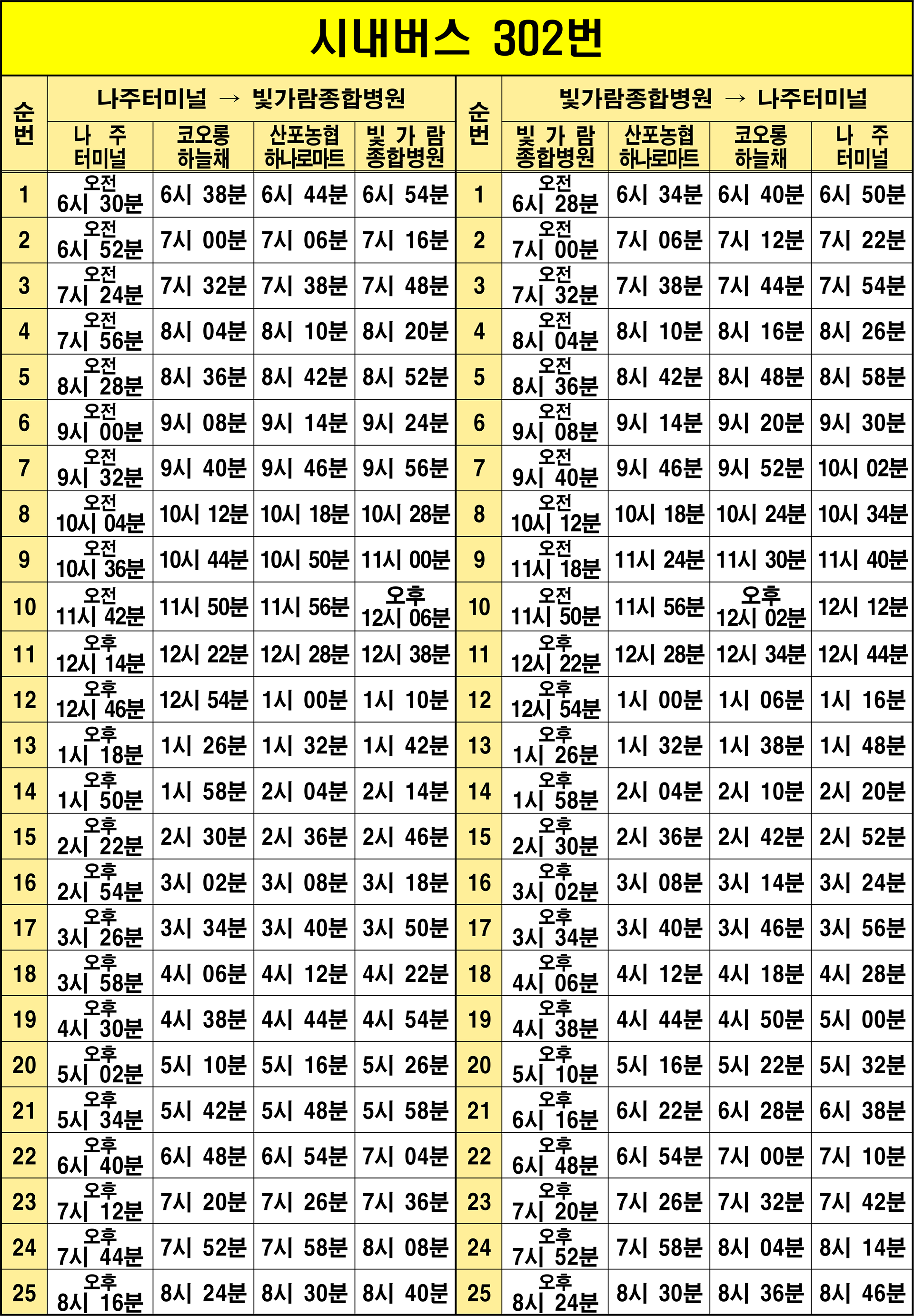 나주 302번: 1. 나주터미널(기점/환승) → 2. 교통센터 → 3. 미곡 → 4. 금천사거리/광탄마을(환승) → 5. 남양유업 → 6. 촌곡.배박물관 → 7. 코오롱하늘채후문 → 8. 우미린아파트(북) → 9. 유전저수지 → 10. 중흥S클래스리버티 → 11. 산포농협.하나로마트 → 12. 한빛1교 → 13. 우정사업정보센터후문 → 14. 빛가람병원후문(회차지/환승) → 15. 우정사업정보센터후문 → 16. 한빛1교 → 17. 산포농협.하나로마트 → 18. 중흥S클래스리버티 → 19. 유전저수지 → 20. 우미린아파트(북) → 21. 코오롱하늘채후문 → 22. 효사랑병원.삼진종합앞 → 23. 촌곡.배박물관 → 24. 남양유업 → 25. 금천사거리/광탄마을(환승) → 26. 원촌 → 27. 나주터미널(종점/환승)