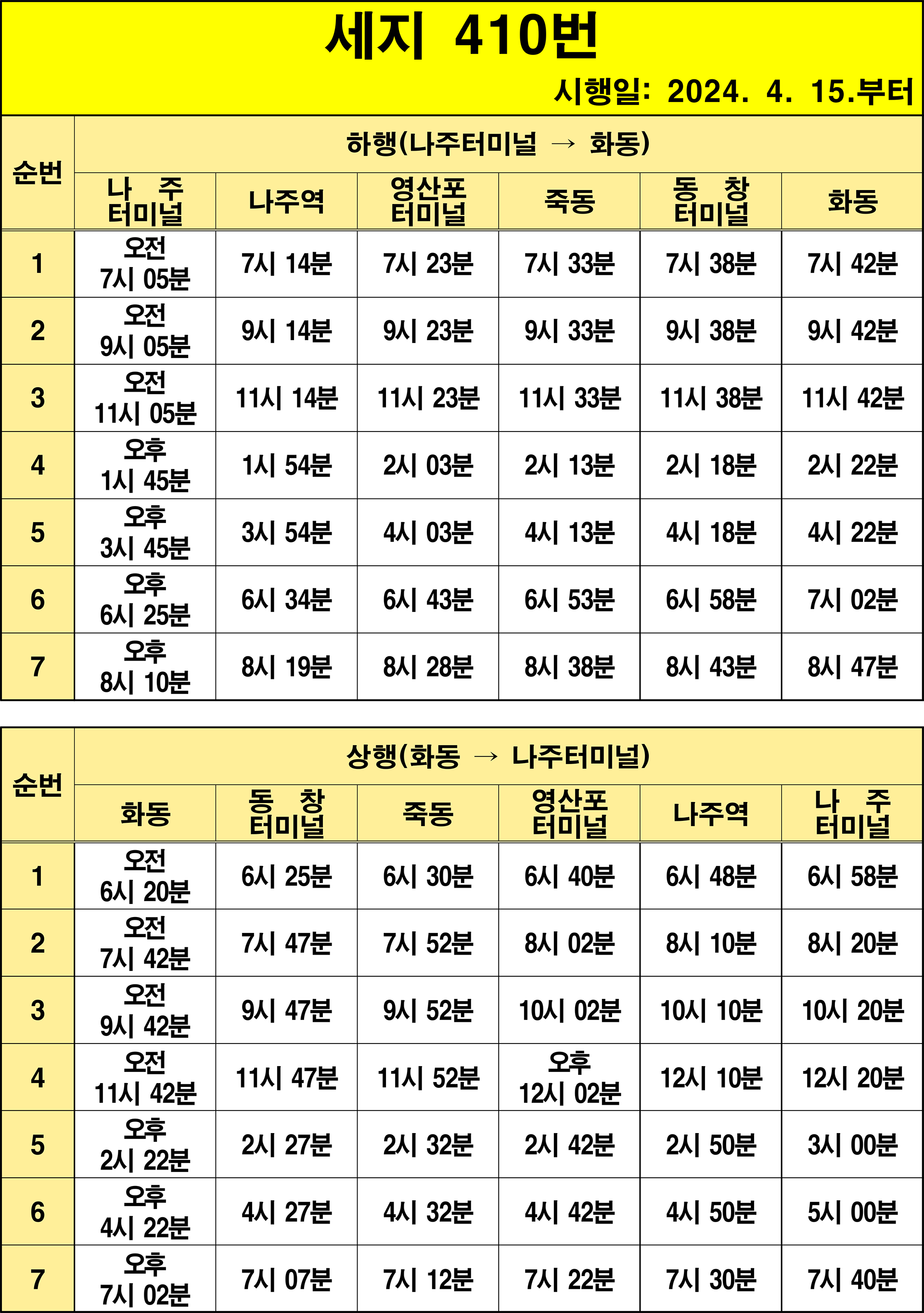 나주 410번: 1.화동(기점) → 2.세지초교 → 3.동창터미널 → 4.세지초교 → 5.섬멀 → 6.벽류정 → 7.발산 → 8.풍동 → 9.덕정 → 10.조양 → 11.압지 → 12.송암 → 13.죽동 → 14.석고.봉학 → 15.금동 → 16.신가 → 17.양산 → 18.천곡 → 19.봉성 → 20.풍물시장 → 21.나주.광주요양병원 → 22.영산포터미널(상행) → 23.풍물시장 → 24.보건소 → 25.이창동행정복지센터 → 26.선창 → 27.영강동행정복지센터 → 28.영강사거리 → 29.대덕아파트 → 30.나주국민체육센터 → 31.나주역 → 32.나주시청 → 33.나주문화예술회관 → 34.송월부영아파트 → 35.소방삼거리 → 36.나주고교 → 37.백민원 → 38.천주교사거리 → 39.나주중앙병원 → 40.나주터미널(상행)(회차지) → 41.나주터미널(하행) → 42.성북아파트 → 43.천주교사거리 → 44.나주고교 → 45.소방삼거리 → 46.나주문화예술회관 → 47.흥룡마을입구 → 48.나주시청 → 49.나주역 → 50.나주국민체육센터 → 51.대덕아파트 → 52.영강사거리 → 53.영강사거리 → 54.영강동행정복지센터 → 55.선창 → 56.이창동행정복지센터 → 57.보건소 → 58.풍물시장 → 59.나주.광주요양병원 → 60.영산포터미널(하행) → 61.풍물시장 → 62.봉성 → 63.천곡 → 64.양산 → 65.신가 → 66.금동 → 67.석고.봉학 → 68.죽동 → 69.송암 → 70.압지 → 71.조양 → 72.덕정 → 73.풍동 → 74.발산 → 75.벽류정 → 76.섬멀 → 77.세지초교 → 78.동창터미널 → 79.세지초교 → 80.화동(종점)