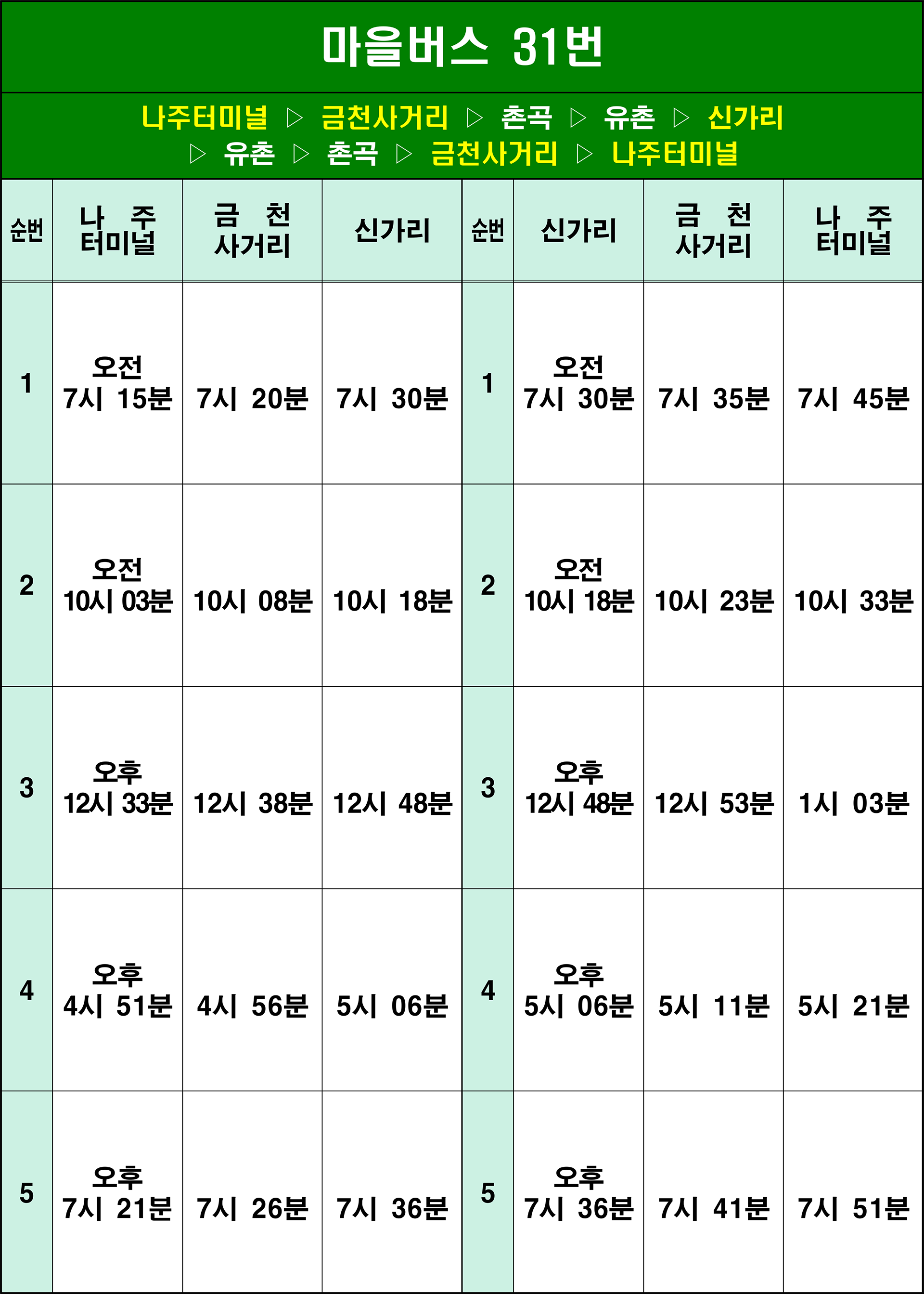 나주 31번: 1. 나주터미널(기점/환승) → 2. 교통센터 → 3. 미곡 → 4. 금천사거리.광탄마을 → 5. 촌곡 → 6. 촌곡1구 → 7. 평촌 → 8. 송촌 → 9. 이천 → 10. 신광.유촌 → 11. 신가리.당가마을(회차지) → 12. 신광.유촌 → 13. 이천 → 14. 송촌 → 15. 평촌 → 16. 촌곡1구 → 17. 촌곡 → 18. 금천사거리.광탄마을 → 19. 원촌 → 20. 나주터미널(종점/환승)