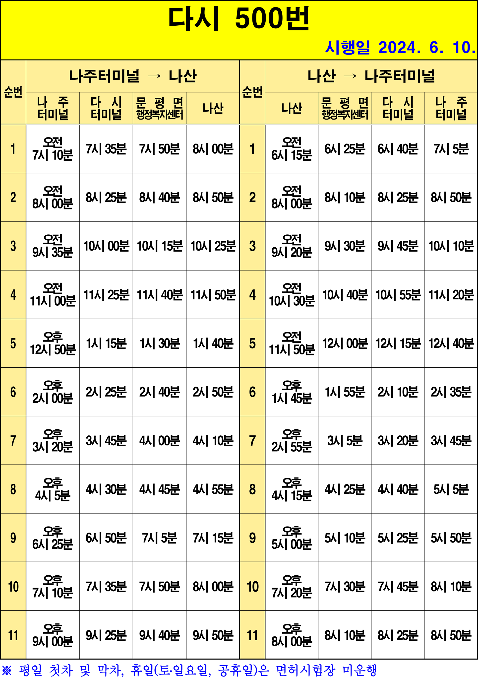 나주 500번(면허시험장경유): 1.나산(기점) → 2.나산화전마을 → 3.백인 → 4.상하 – 5.명하 → 6.옥동 → 7.지산 → 8.송림 → 9.다돈산업 → 10.신안마을 → 11.문평면행정복지센터 → 12.오륜 → 13.남산마을입구 → 14.남산 → 15.금산 → 16.금당 → 17.평산 → 18.신옥.고막원 → 19.통문마을 → 20.금옥마을 → 21.금옥 → 22.3M → 23.현대의원 → 24.다시파출소 → 25.다시터미널 → 26.고구려대기숙사 → 27.고구려대 → 28.강암 → 29.강암.복암1리 → 30.중동 → 31.랑동 → 32.회진 → 33.백하 → 34.사직.풍호촌 → 35.영모정 → 36.구진포 → 37.전추마을 → 38.용두 → 39.제창 → 40.택촌 → 41.면허시험장 → 42.면허시험장입구 → 43.영강삼거리 → 44.영산포철도공원(동) → 45.대덕아파트 → 46.나주국민체육센터 → 47.나주역 → 48.나주시청 → 49.나주문화예술회관 → 50.송월부영아파트 → 51.소방삼거리 → 52.나주고교 → 53.백민원 → 54.천주교사거리 → 55.나주중앙병원 → 56.동점문입구 → 57.나주터미널(상행)(회차지) → 58.나주터미널(하행) → 59.목사고을시장입구 → 60.성북아파트 → 61.천주교사거리 → 62.나주고교 → 63.소방삼거리 → 64.나주문화예술회관 → 65.흥룡마을입구 → 66.나주시청 → 67.나주역 → 68.나주국민체육센터 → 69.대덕아파트 → 70.영강사거리 → 71.영강삼거리 → 72.영산포철도공원(북) → 73.면허시험장입구 → 74.면허시험장 → 75.택촌 → 76.제창 → 77.용두 → 78.전추마을 → 79.구진포 → 80.영모정 → 81.사직.풍호촌 → 82.백하 → 83.회진 → 84.랑동 → 85.중동 → 86.강암.복암1리 → 87.강암 → 88.고구려대 → 89.고구려대기숙사 → 90.다시터미널 → 91.다시파출소 → 92.현대의원 → 93.3M → 94.금옥.문평농공단지 → 95.금옥마을 → 96.통문마을 → 97.신옥.고막원 → 98.평산 → 99.금당 → 100.금산 → 101.남산 → 102.남산마을입구 → 103.오륜 → 104.문평면행정복지센터 → 105.신안마을 → 106.다돈산업 → 107.송림 → 108.지산 → 109.옥동 → 110.명하 → 111.상하 → 112.백인 → 113.나산화전마을 – 114.나산(종점)