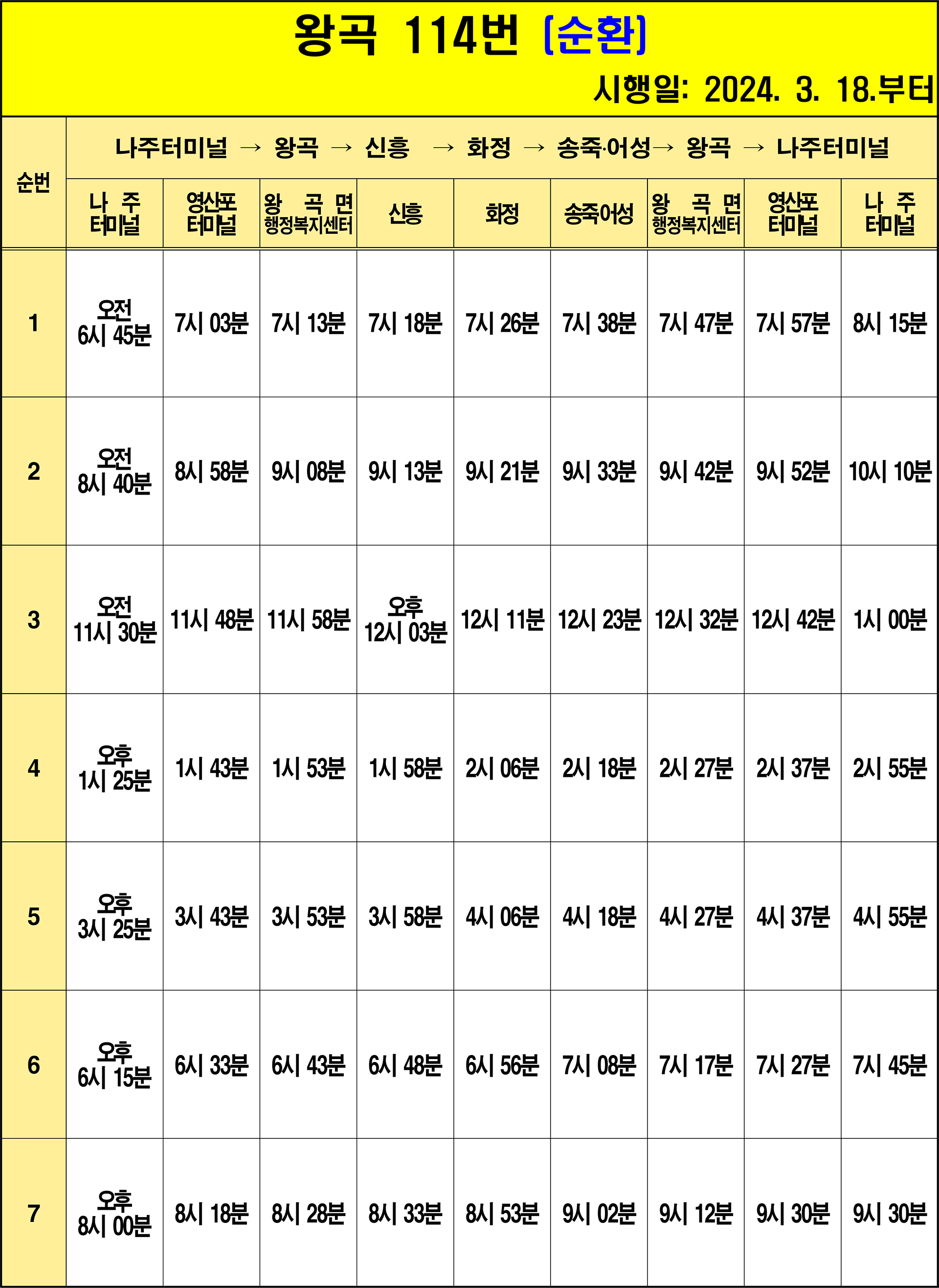 나주 114번: 1.나주터미널(하행)(기점) → 2.성북아파트 → 3.천주교사거리 → 4.나주고교 → 5.소방삼거리 → 6.나주문화예술회관 → 7.흥룡마을입구 → 8.나주시청 → 9.나주역 → 10.나주국민체육센터 → 1.대덕아파트 → 12.영강사거리 → 13.노인복지관 → 14.이창사거리.남교동 → 15.영산포터미널(하행) → 16.풍물시장 → 17.석기내 → 18.석계 → 19.동수동생물산업단지입구 → 20.동령 → 21.동수.오량.농공단지 → 22.동방 → 23.연동 → 24.왕곡면행정복지센터(북) → 25.본양1구 → 26.본양2구 → 27.신흥 → 28.본양2구 → 29.본양1구 → 30.왕곡면행정복지센터 → 31.화정 → 32.호동 → 33.옥곡 → 34.왕곡초교 → 35.구천 → 36.산정 → 37.박포 → 38.외구 → 39.송죽2리.귀엽 – 40.송죽.어성(회차지) → 41.송죽2리.귀엽 → 42.외구 – 43.박포 → 44.산정 → 45.구천 → 46.왕곡초교 → 47.옥곡 → 48.호동 → 49.왕곡면행정복지센터 → 50.연동 → 51.동방 → 52.동수.오량.농공단지 → 53.동령 → 54.동수동생물산업단지입구 → 55.석계 → 56.석기내 57.풍물시장 → 58.나주.광주요양병원 → 59.영산포터미널(상행) → 60.이창사거리.남교동 61.노인복지관 → 62.영강사거리.영산대교 → 63.대덕아파트 → 64.나주국민체육센터 → 65.나주역 → 66.나주시청 → 67.나주문화예술회관 → 68.송월부영아파트 → 69.소방삼거리 → 70.나주고교 → 71.백민원 → 72.천주교사거리 → 73.나주중앙병원 – 74.나주터미널(상행)(종점)