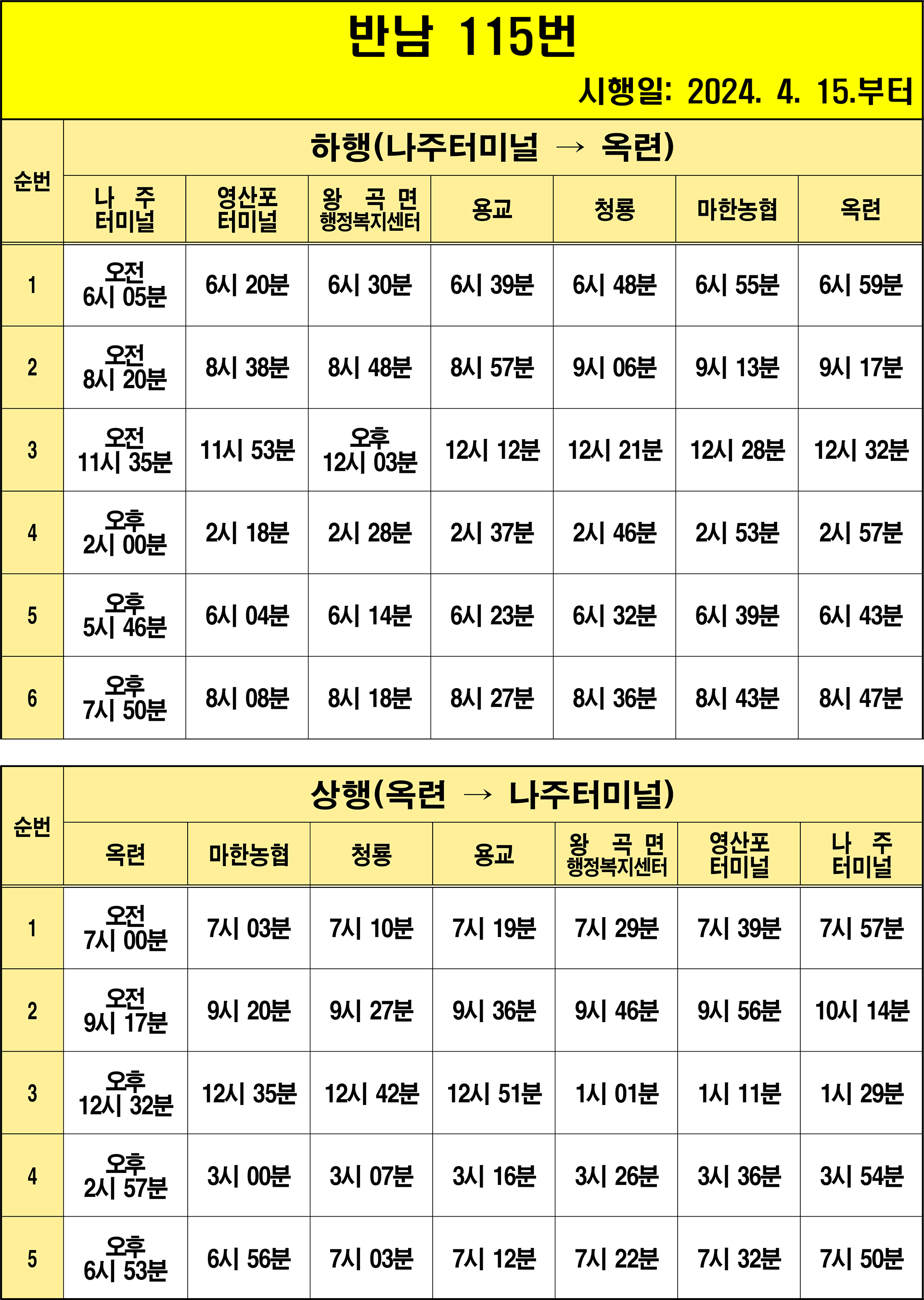 나주 115번: 1.옥련(기점) → 2.도남 → 3.부흥.흥덕 → 4.마한농협 → 5.봉현 → 6.성내 → 7.이암.목교 → 8.이암 → 9.상두 → 10.청룡 → 11.장송 → 12.대서 → 13.마산 → 14.용교 → 15.월봉 → 16.왕곡초교 → 17.옥곡 → 18.호동 → 19.왕곡면행정복지센터 → 20.연동 → 21.동방 → 22.동수.오량.농공단지 → 23.동령 → 24.동수동생물산업단지입구 → 25.석계 → 26.석기내 → 27.풍물시장 → 28.나주.광주요양병원 → 29.영산포터미널(상행) → 30.이창사거리.남교동 → 31.노인복지관 → 32.영강사거리.영산대교 → 33.대덕아파트 → 34.나주국민체육센터 → 35.나주역 → 36.나주시청 → 37.나주문화예술회관 → 38.송월부영아파트 → 39.소방삼거리 → 40.나주고교 → 41.백민원 → 42.천주교사거리 → 43.나주중앙병원 – 44.나주터미널(상행)(회차지) → 45.나주터미널(하행) → 46.성북아파트 → 47.천주교사거리 → 48.나주고교 → 49.소방삼거리 → 50.나주문화예술회관 → 51.흥룡마을입구 → 52.나주시청 → 53.나주역 → 54.나주국민체육센터 → 55.대덕아파트 → 56.영강사거리 → 57.노인복지관 → 58.이창사거리.남교동 → 59.영산포터미널(하행) → 60.풍물시장 → 61.석기내 → 62.석계 → 63.동수동생물산업단지입구 → 64.동령 → 65.동수.오량.농공단지 → 66.동방 → 67.연동 → 68.왕곡면행정복지센터 → 69.호동 → 70.옥곡 → 71.왕곡초교 → 72.월봉 → 73.용교 → 74.마산 → 75.대서 → 76.장송 → 77.청룡 → 78.상두 → 79.이암 → 80.이암.목교 → 81.성내 → 82.봉현 → 83.마한농협 → 84.부흥.흥덕 → 85.도남 – 86.옥련(종점)