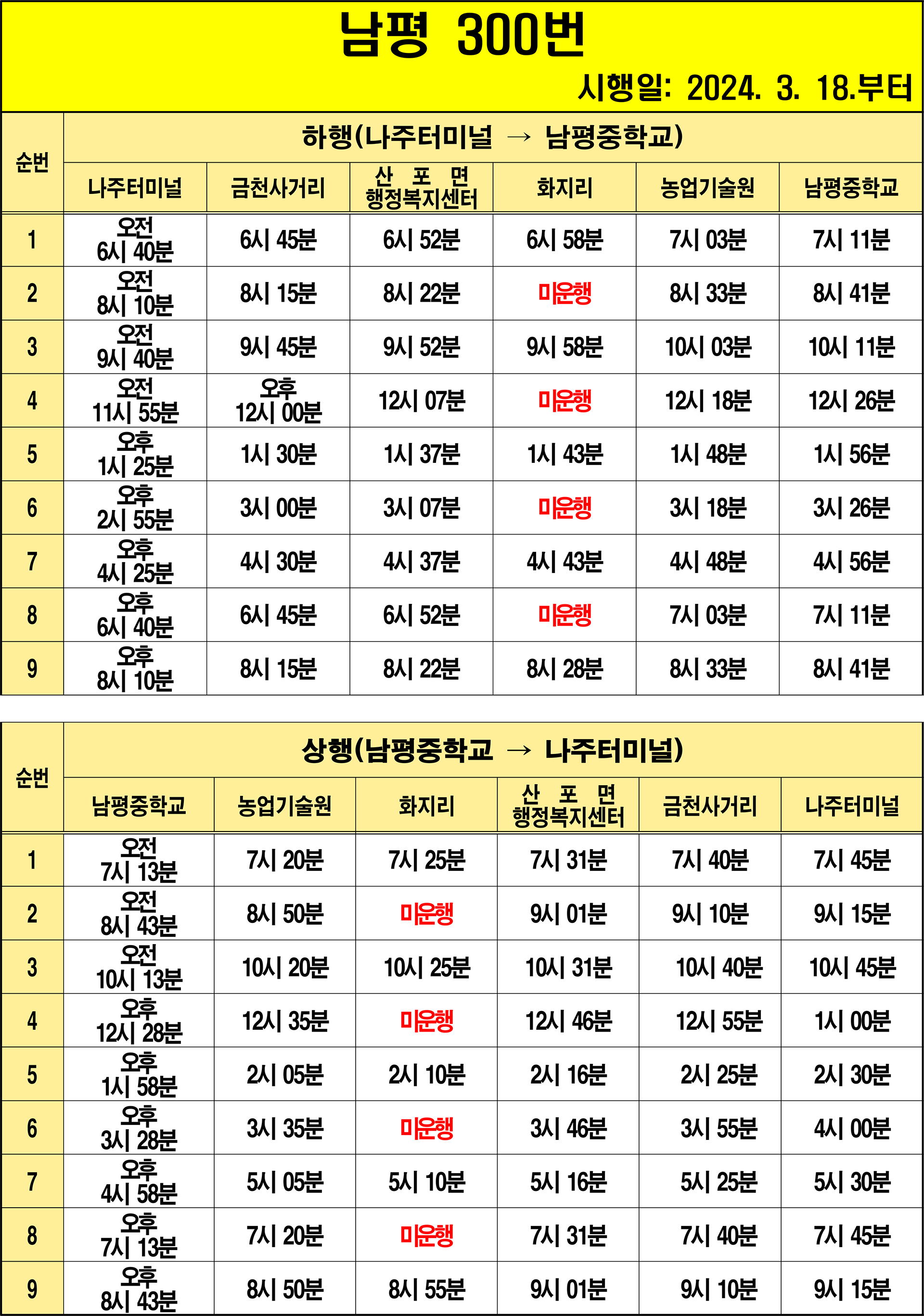 나주 300번(화지리 미경유): 1.남평중학교(기점) → 2.남평정류장 → 3.남평시장 → 4.연합의원 → 5.교촌마을 → 6.원촌.광남고 → 7.교원삼거리 8.방축마을 → 9.남평미래병원 → 10.팔마아파트 → 11.농업기술원 → 12.매화.신흥 → 13.매화동 → 14.식산 → 15.산제 → 16.화지마을 → 17.송림 → 18.송림입구 → 19.통정 → 20.통정마을 → 21.산포초교 → 22.매성.산포농협 23.산포면행정복지센터입구 → 24.내정 → 25.내상 → 26.효사랑병원.삼진종합앞 → 27.촌곡.배박물관 → 28.남양유업 → 29.금천사거리.광탄마을 → 30.원촌 → 31.나주터미널(상행)(회차지) → 32.나주터미널(하행) → 33.교통센터 → 34.미곡 → 35.금천사거리.광탄마을 → 36.남양유업 → 37.촌곡.배박물관 → 38.효사랑병원.삼진종합앞 → 39.내상 → 40.내정 → 41.산포면행정복지센터입구 → 42.매성.산포농협 → 43.산포초교 → 44.통정마을 → 45.통정 → 46.송림입구 → 47.송림 → 48.화지마을 → 49.산제 → 50.산제 → 51.식산 → 52.매화동 → 53.매화․신흥 → 54.농업기술원 → 55.팔마아파트 → 56.남평미래병원 → 57.방축마을 → 58.교원삼거리 → 59.원촌.광남고 → 60.교촌마을 → 61.연합의원 → 62.남평시장 → 63.남평정류장 – 64.남평중학교(종점)