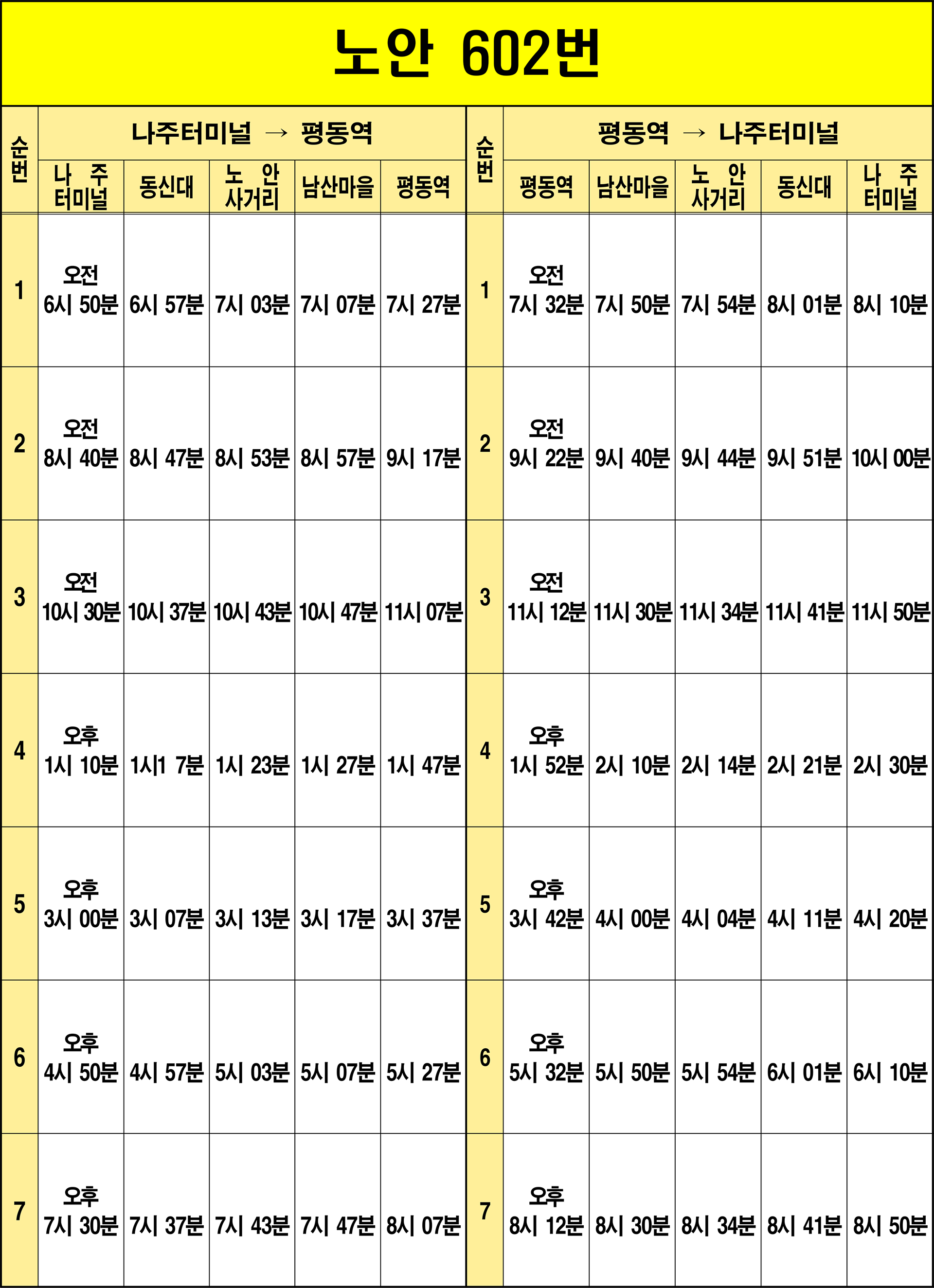 나주 602번: 1. 나주터미널(기점/환승) → 2. 목사고을시장 → 3. 호반아파트 → 4. 대방아파트 → 5. 정렬사 → 6. 싸이클경기장 → 7. 동신대학교 → 8. 동신대학교후문 → 9. 칠전마을입구 → 10. 연화제 → 11. 홍수통제소 → 12. 송계 → 13. 송촌 → 14. 용암마을.목자동 → 15. 노안면행정복지센터(환승) → 16. 구노안면사무소 → 17. 제일의원앞 → 18. 금암천주교 → 19. 고정마을 → 20. 남산 → 21. 남산 → 22. 고정마을 → 23. 금암천주교 → 24. 제일의원앞 → 25. 구노안면사무소 → 26. 노안면행정복지센터 → 27. 주업정 → 28. 유곡 → 29. 버드실 → 30. 하치 → 31. 현애마을 → 32. 감정 → 33. 평동역(동)(회차지) → 33. 평동역(동)(회차지) → 34. 감정 → 35. 현애마을 → 36. 하치 → 37. 버드실 → 38. 유곡 → 39. 주업정 → 40. 노안면행정복지센터(환승) → 41. 구노안면사무소 → 42. 제일의원앞 → 43. 금암천주교 → 44. 고정마을 → 45. 남산 → 46. 남산 → 47. 고정마을 → 48. 금암천주교 → 49. 제일의원앞 → 50. 구노안면사무소 → 51. 노안면행정복지센터 → 52. 노안사거리 → 53. 용암마을.목자동 → 54. 송촌 → 55. 송계 → 56. 홍수통제소 → 57. 연화제 → 58. 칠전마을입구 → 59. 동신대학교후문 → 60. 동신대학교 → 61. 싸이클경기장 → 62. 정렬사 → 63. 정렬사입구 → 64. 대방아파트 → 65. 호반아파트 → 66. 나주여고 → 67. 나주터미널(종점/환승)