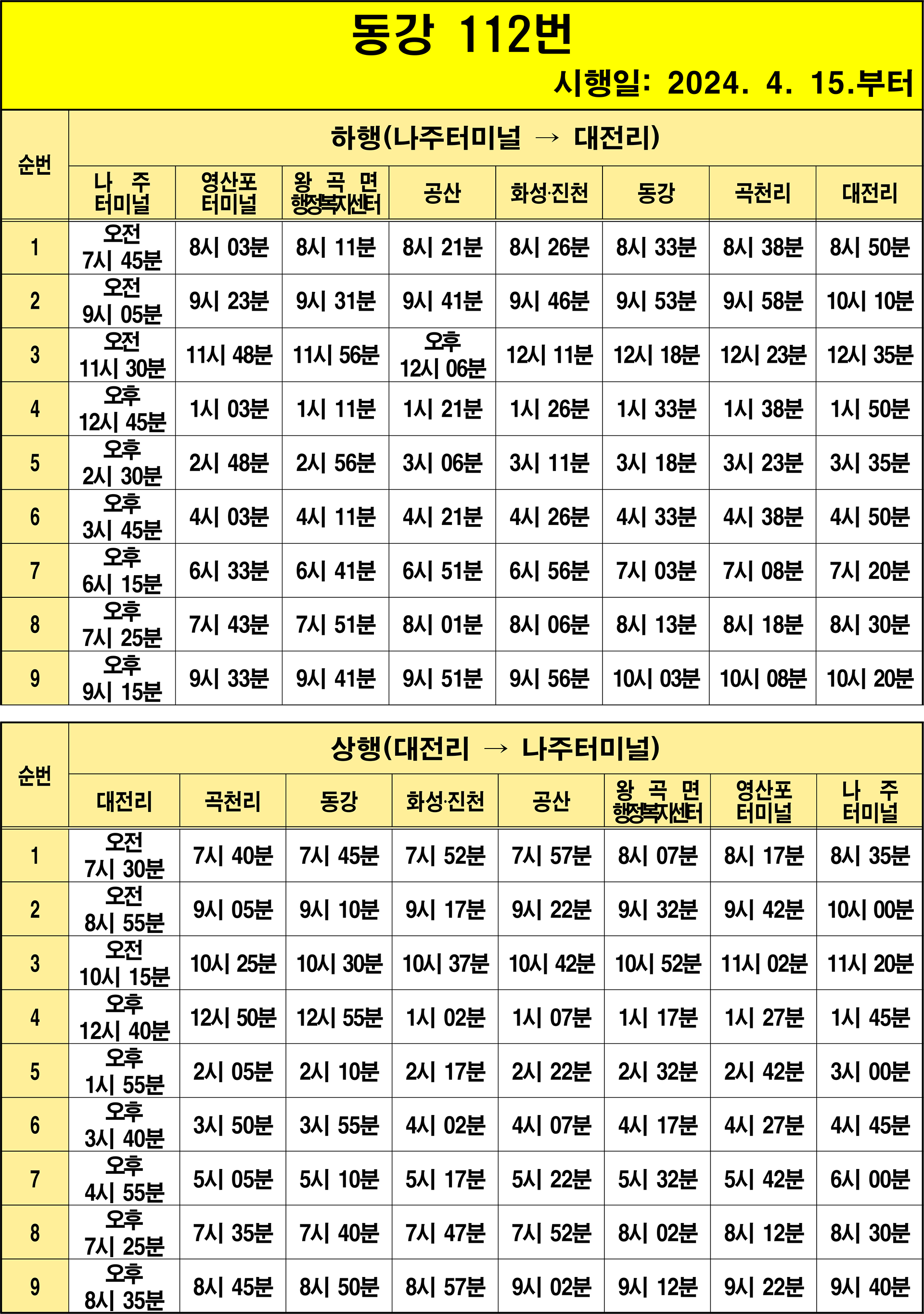 나주 112번: 1.대전리(기점) → 2.동전마을 → 3.대전2리 → 4.수문 → 5.수랑 → 6.수랑골 → 7.본촌마을 → 8.구양.월량3구 → 9.신양.월량2구 →10.무회 → 11.곡천리 → 12.무회 → 13.동강 → 14.월량.후동사거리 → 15.내동 → 16.진천2구회관 → 17.진천2구 → 18.진천1구동몰마을입구 → 19.화성1구.성남 → 20.화성3구.청룡 → 21.화성2구 → 22.화성2구 → 23.송산 → 24.상장성 → 25.공산 → 26.공산고 → 27.복사초리.상방리 → 28.나주C.C.입구 → 29.청송입구 → 30.내동 → 31.박포 → 32.산정 → 33.구천 → 34.왕곡초교 → 35.옥곡 → 36.호동 → 37.왕곡면행정복지센터 → 38.연동 → 39.동방 → 40.동수.오량.농공단지 → 41.동령 → 42.동수동생물산업단지입구 → 43.석계(회차지) → 44.석기내 → 45.풍물시장 → 46.나주.광주요양병원 → 47.영산포터미널(상행) → 48.이창사거리.남교동 → 49.노인복지관 → 50.영강사거리.영산대교 → 51.대덕아파트 → 52.나주국민체육센터 → 53.나주역 → 54.나주시청 → 55.나주문화예술회관 → 56.송월부영아파트 → 57.소방삼거리 → 58.나주고교 → 59.백민원 → 60.천주교사거리 → 61.나주중앙병원 → 62.나주터미널(상행) → 63.나주터미널(하행) → 64.성북아파트 → 65.천주교사거리 → 66.나주고교 – 67.소방삼거리 → 68.나주문화예술회관 → 69.흥룡마을입구 → 70.나주시청 → 71.나주역 → 72.나주국민체육센터 → 73.대덕아파트 → 74.영강사거리 → 75.노인복지관 → 76.이창사거리.남교동 → 77.영산포터미널(하행) → 78.풍물시장 → 79.석기내 → 80.석계 →81.동수동생물산업단지입구 → 82.동령 → 83.동수.오량.농공단지 → 84.동방 → 85.연동 → 86.왕곡면행정복지센터 → 87.호동 → 88.옥곡 → 89.왕곡초교 → 90.구천 → 91.산정 → 92.박포 → 93.내동 → 94.청송입구 → 95.나주C.C.입구 → 96.복사초리.상방리 → 97.공산고 →98.공산 → 99.상장성 → 100.중도 → 101.송산 → 102.화성2구 → 103.화성2구 → 104.화성3구.청룡 → 105.화성1구.성남 → 106.진천1구동몰마을입구 → 107.진천2구 → 108.진천2구회관 → 109.내동 → 110.월량.후동사거리 → 111.동강 → 112.무회 → 113.곡천리 → 114.무회 → 115.신양.월량2구 → 116.구양.월량3구 → 117.본촌마을 → 118.수랑골 → 119.수랑 → 120.대전2리 → 121.동전마을 – 122.대전리(종점)