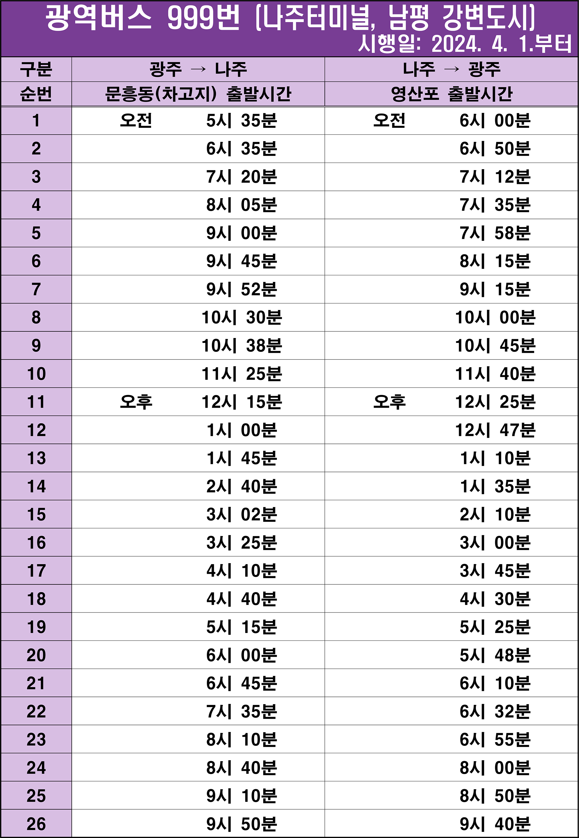 나주 시외버스 터미널 시간표/요금표 2025년 03월 25일 기준