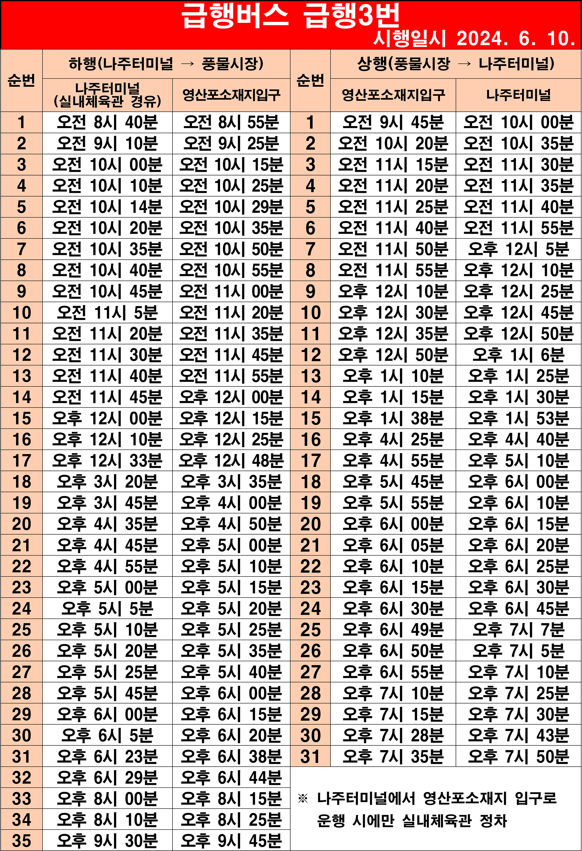 나주 급행3번: 1. 나주터미널(기점/환승) → 2. 성북아파트 → 3. 실내체육관 → 4. 영산포소재지입구 → 5. 풍물시장(회차지) → 6. 풍물시장 → 7. 영산포소재지입구 → 8. 나주중앙병원 → 9. 나주터미널(종점/환승) ※ 3. 실내체육관은 풍물시장 방면 시에만 정차