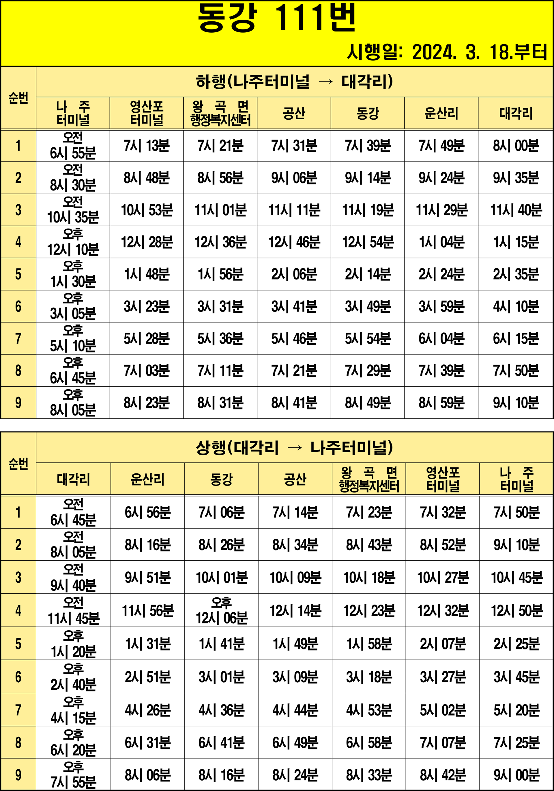 나주 111번: 1.대각리(기점) → 2.백연동.대지리 → 3.운지 → 4.산정 → 5.월송 → 6.월송2구 → 7.송암 → 8.송암 → 9.양지사거리 → 10.모산계 → 11.종골.곡강분교 → 12.양지리 → 13.운산리입구 → 14.운산리종점 → 15.운산리입구 → 16.양지리 → 17.종골.곡강분교 → 18.모산계 → 19.양지사거리 → 20.양지3구 → 21.월현마을 → 22.병반사거리 → 23.인동촌.인동4리 → 24.동강면행정복지센터 → 25.동강 → 26.월량.후동사거리 → 27.후동 → 28.동촌2구 → 29.동촌.가송입구 → 30.독와실 → 31.송산 → 32.상장성 → 33.공산 → 34.공산고 → 35.복사초리.상방리 → 36.나주C.C.입구 → 37.청송입구 → 38.내동 → 39.박포 → 40.산정 → 41.구천 → 42.왕곡초교 → 43.옥곡 → 44.호동 → 45.왕곡면행정복지센터 → 46.연동 → 47.동방 → 48.동수.오량.농공단지 → 49.동령 → 50.동수동생물산업단지입구 → 51.석계 → 52.석기내 → 53.풍물시장 → 54.나주.광주요양병원 → 55.영산포터미널(상행) → 56.이창사거리.남교동 → 57.노인복지관 → 58.영강사거리.영산대교 → 59.대덕아파트 → 60.나주국민체육센터 → 61.나주역 → 62.나주시청 → 63.나주문화예술회관 → 64.송월부영아파트 → 65.소방삼거리 → 66.나주고교 → 67.백민원 → 68.천주교사거리 → 69.나주중앙병원 → 70.나주터미널(상행)(회차지) → 71.나주터미널(하행) → 72.성북아파트 → 73.천주교사거리 → 74.나주고교 → 75.소방삼거리 → 76.나주문화예술회관 → 77.흥룡마을입구 → 78.나주시청 → 79.나주역 → 80.나주국민체육센터 → 81.대덕아파트 → 82.영강사거리 → 83.노인복지관 → 84.이창사거리.남교동 → 85.영산포터미널(하행) → 86.풍물시장 → 87.석기내 → 88.석계 → 89.동수동생물산업단지입구 → 90.동령 → 91.동수.오량.농공단지 → 92.동방 → 93.연동 → 94.왕곡면행정복지센터 → 95.호동 → 96.옥곡 → 97.왕곡초교 → 98.구천 → 99.산정 → 100.박포 → 101.내동 → 102.청송입구 → 103.나주C.C.입구 → 104.복사초리.상방리 → 105.공산고 → 106.공산 → 107.상장성 → 108.중도 → 109.송산 → 110.독와실 → 111.동촌.가송입구 → 112.동촌2구 → 113.후동 → 114.월량.후동사거리 → 115.동강 → 116.동강면행정복지센터 → 117.인동촌.인동4리 → 118.병반사거리 → 119.월현마을 → 120.양지3구 → 121.양지사거리 → 122.모산계 → 123.종골.곡강분교 → 124.양지리 → 125.운산리입구 → 126.운산리종점 → 127.운산리입구 → 128.양지리 → 129.종골.곡강분교 → 130.모산계 → 131.송암 → 132.송암 → 133.월송2구 → 134.월송 → 135.산정 → 136.운지 → 137.백연동.대지리 → 138.대각리(종점)