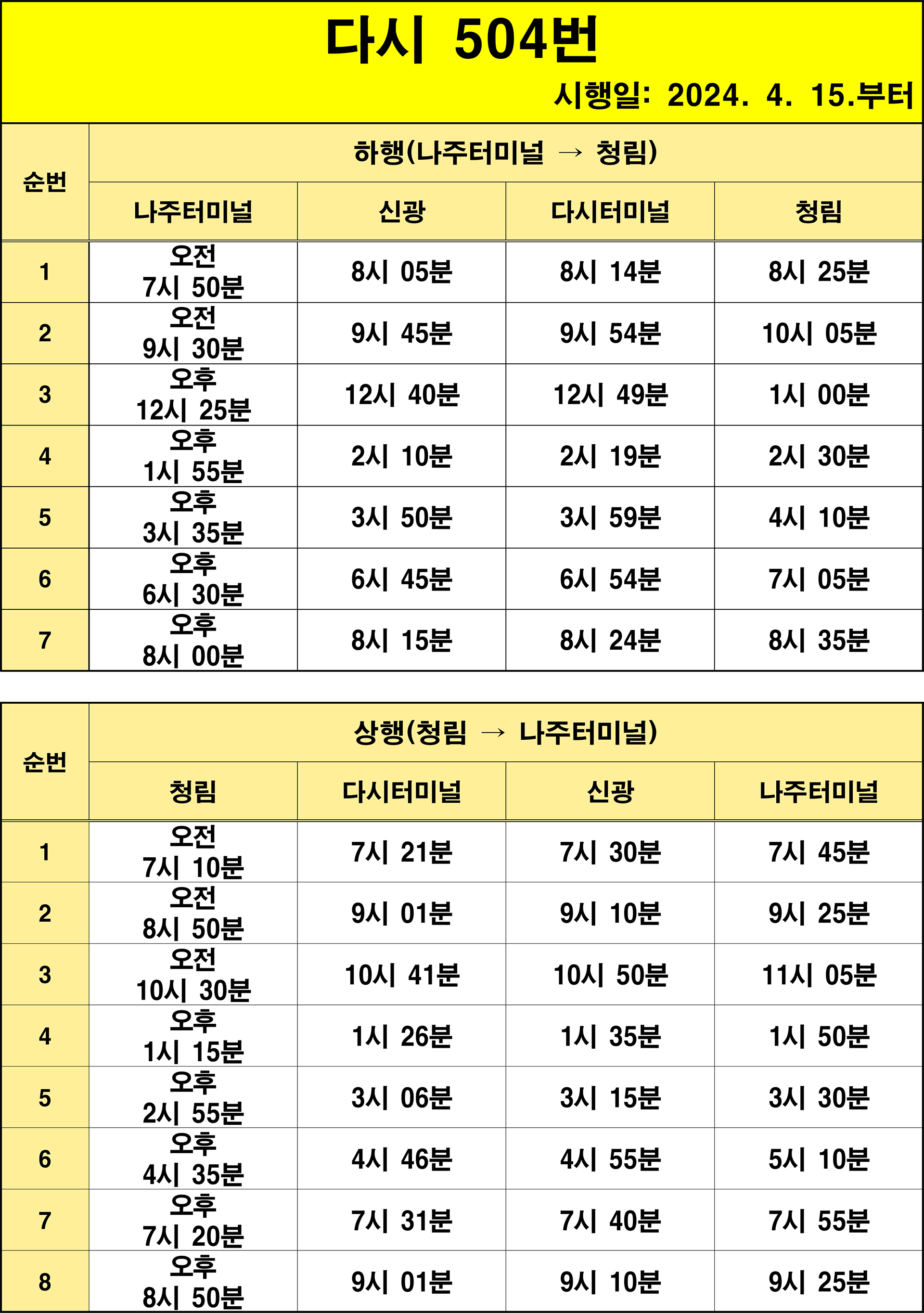 나주 504번: 1.청림마을(기점) → 2.청림 → 3.당촌 → 4.동백 → 5.두만 → 6.중문 → 7.소중문 → 8.학정 → 9.송촌 → 10.반계 → 11.대곡 → 12.월성 → 13.현대의원 → 14.다시파출소 → 15.다시터미널 → 16.원동 → 17.가동 → 18.가동마을 → 19.가운삼거리 → 20.신광리입구 → 21.신광입구 → 22.구암촌 → 23.신광리 → 24.신광종점 → 25.신광리 → 26.구암촌 → 27.신광입구 → 28.용치 → 29.보현.이화영아원입구 → 30.천주교사거리 → 31.나주중앙병원 → 32.동점문입구 → 33.나주터미널(상행)(회차지) → 34.나주터미널(하행) → 35.목사고을시장입구 → 36.성북아파트 → 37.천주교사거리 → 38.보현.이화영아원입구 → 39.용치 → 40.신광입구 → 41.구암촌 → 42.신광리 → 43.신광종점 → 44.신광리 → 45.구암촌 → 46.신광입구 → 47.가운삼거리 → 48.가동마을 → 49.가동 → 50.원동 → 51.다시터미널 → 52.다시파출소 → 53.현대의원 → 54.월성 → 55.대곡 → 56.반계 → 57.송촌 → 58.학정 → 59.소중문 → 60.중문 → 61.두만 → 62.동백 → 63.당촌 → 64.청림 → 65.청림마을(종점)